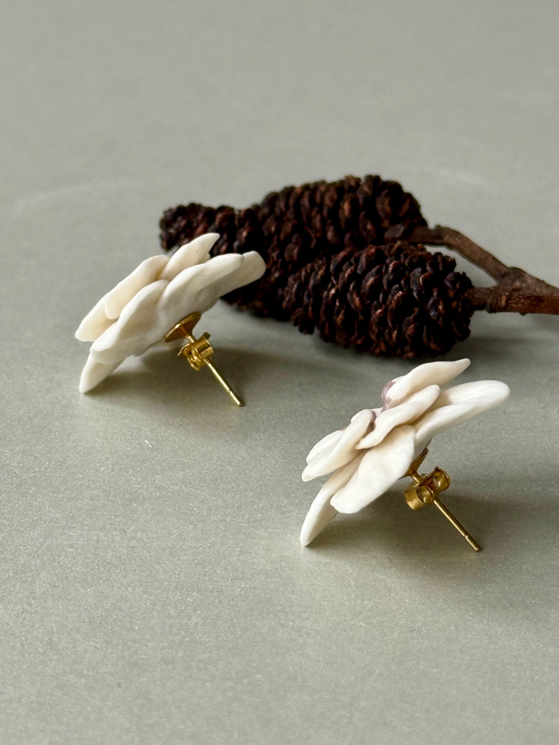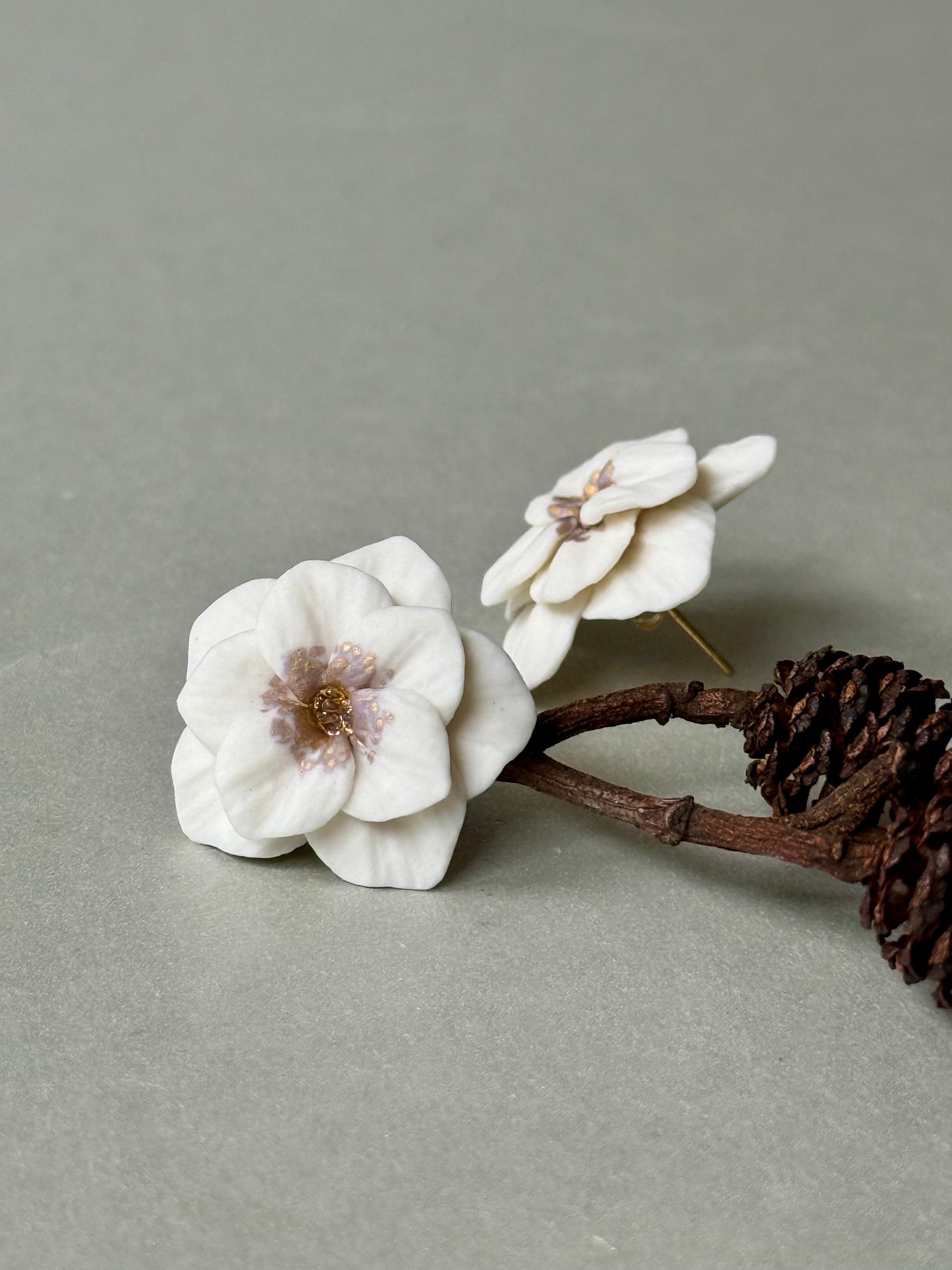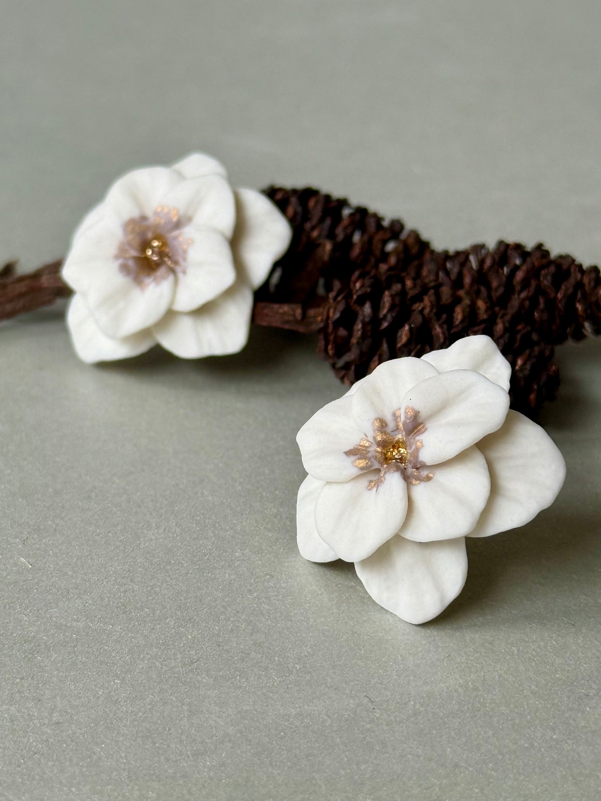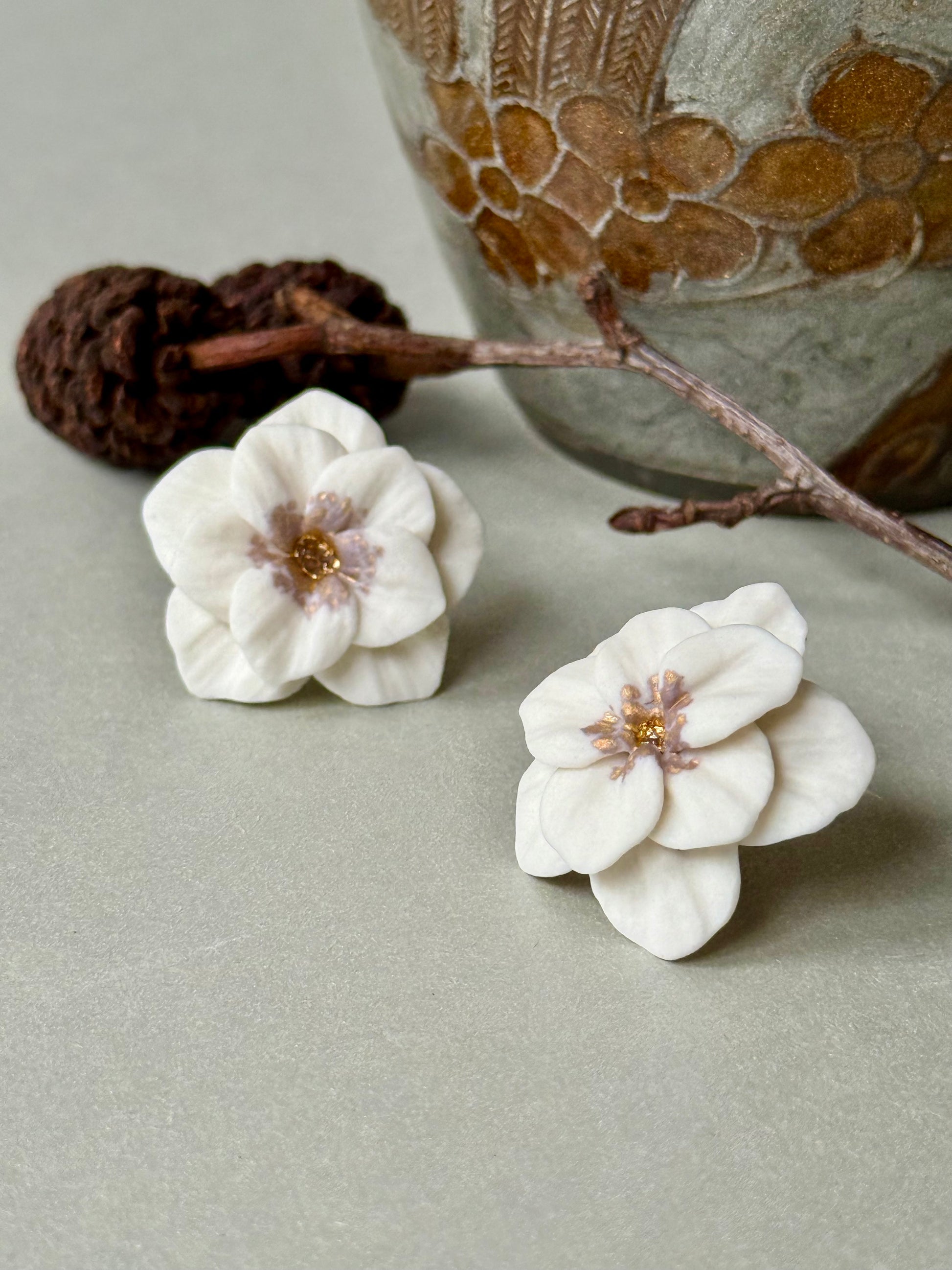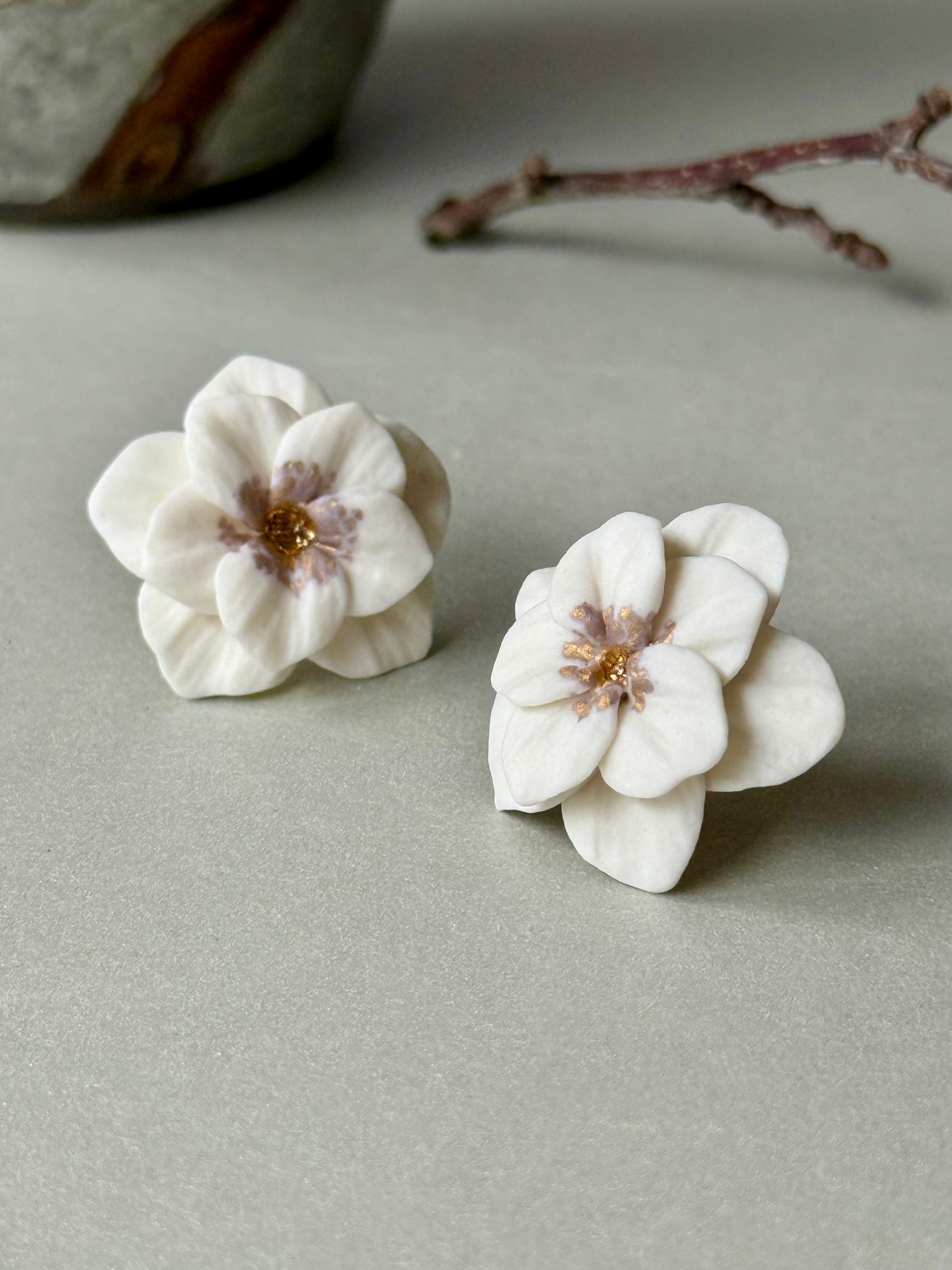 Small porcelain flower earrings. The flower centers are plated with 12% gold. The hardware is made of gold-plated sterling silver. Size: 25 x 25 mm, each earring weighs 3.2 grams.
