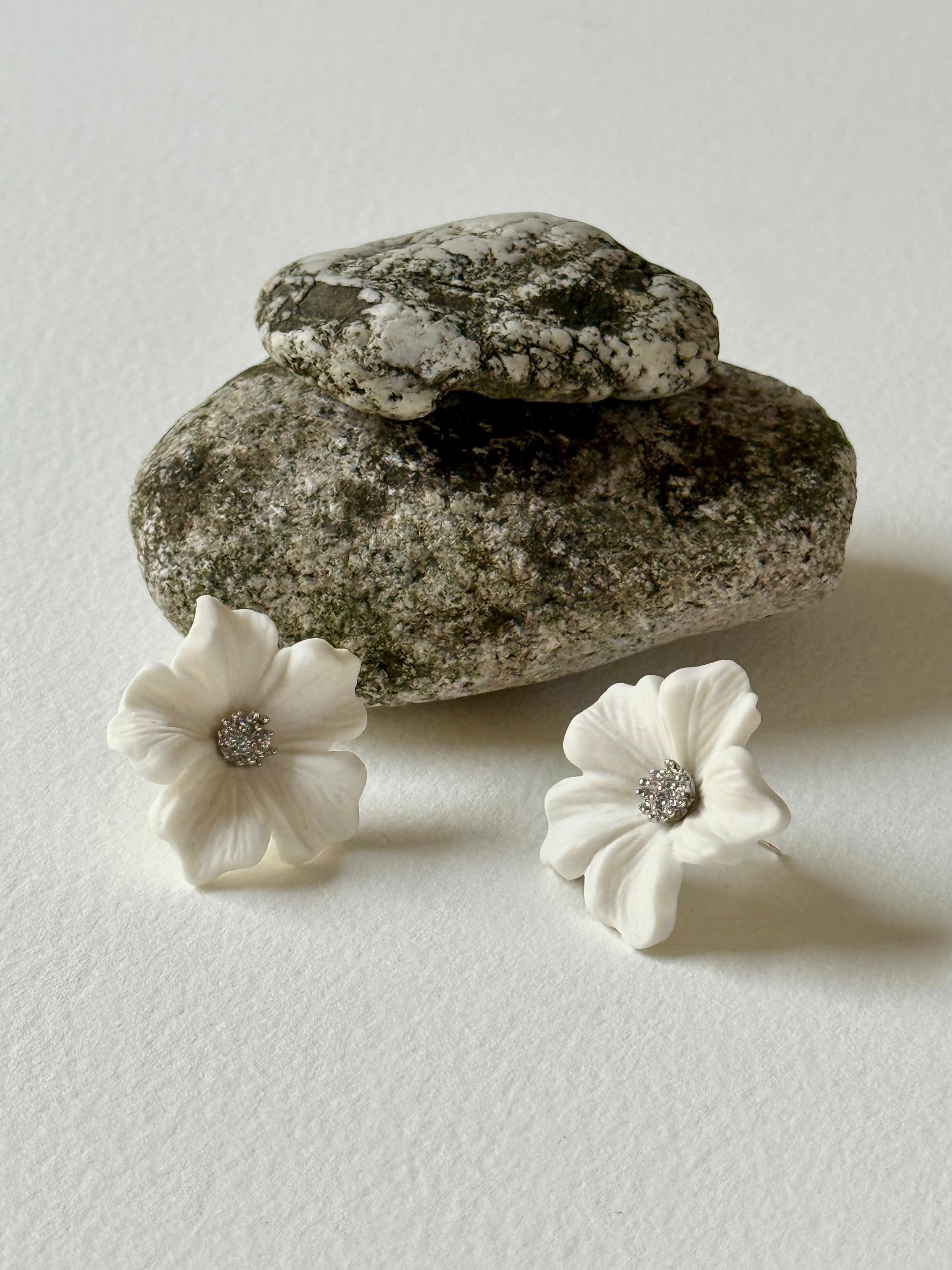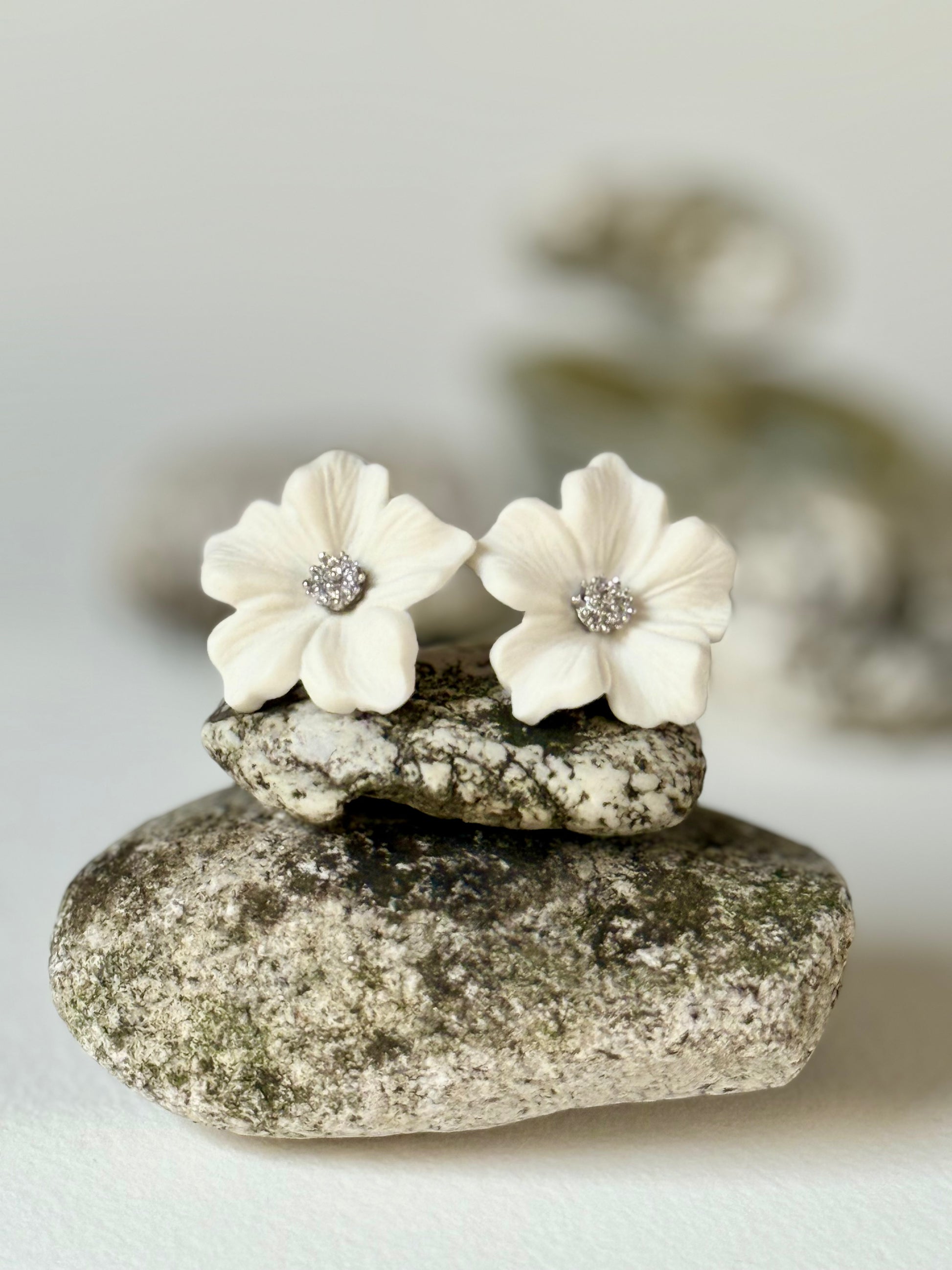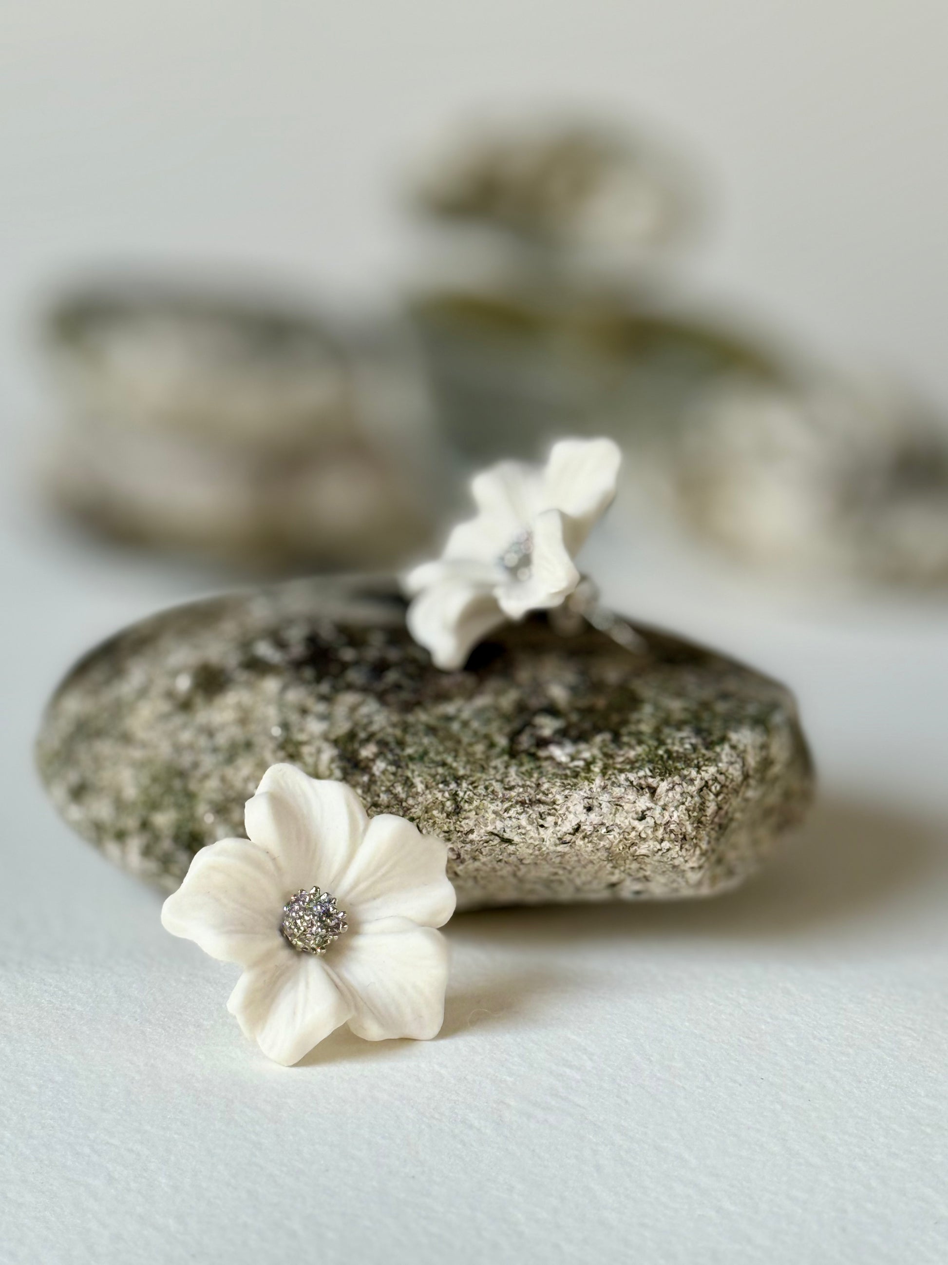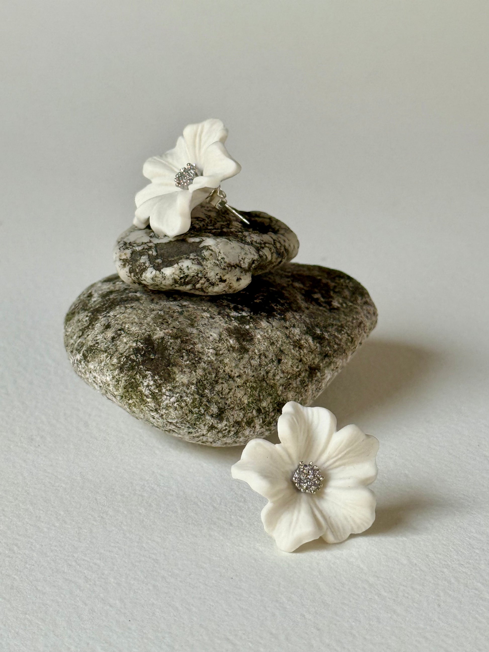 Stud earrings Bells. The flower is made of porcelain, the fittings are 925 sterling silver. The central part of the flower is brass. The weight of each earring is 4,1 g, the size is 30x30 mm.