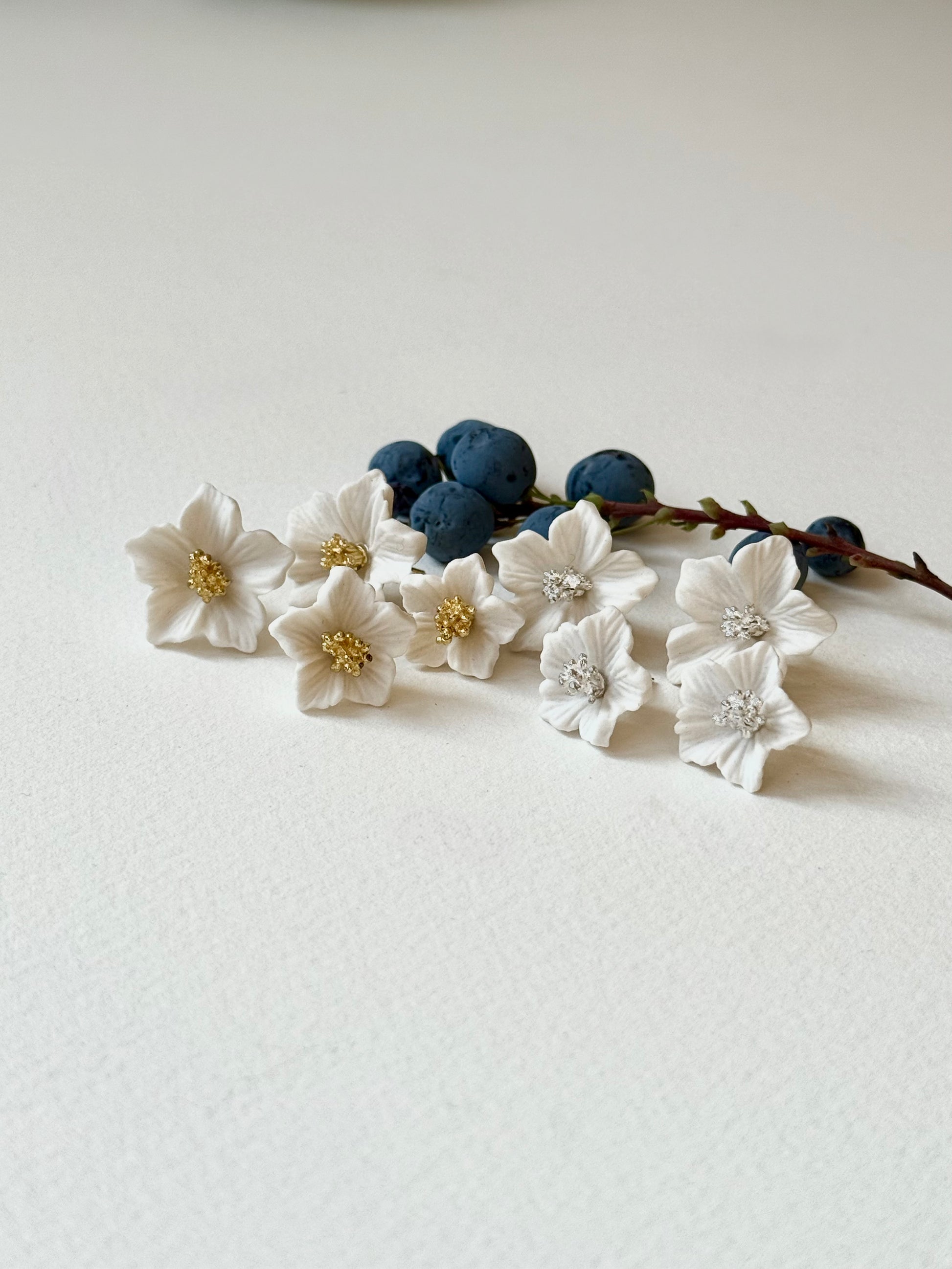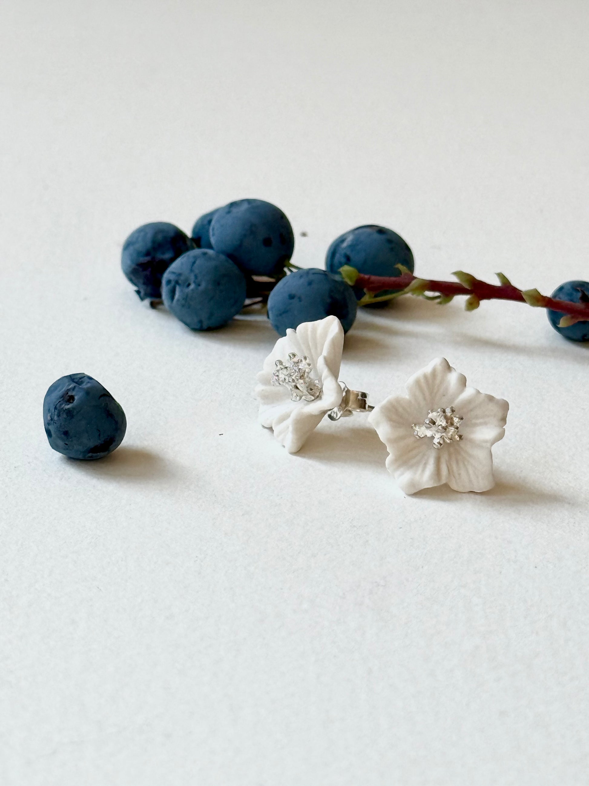 Stud earrings Bells. The flower is made of porcelain, the fittings are 925 silver. The central part of the flower is brass. The weight of each earring is 1,9 g, the size is 18x18 mm.