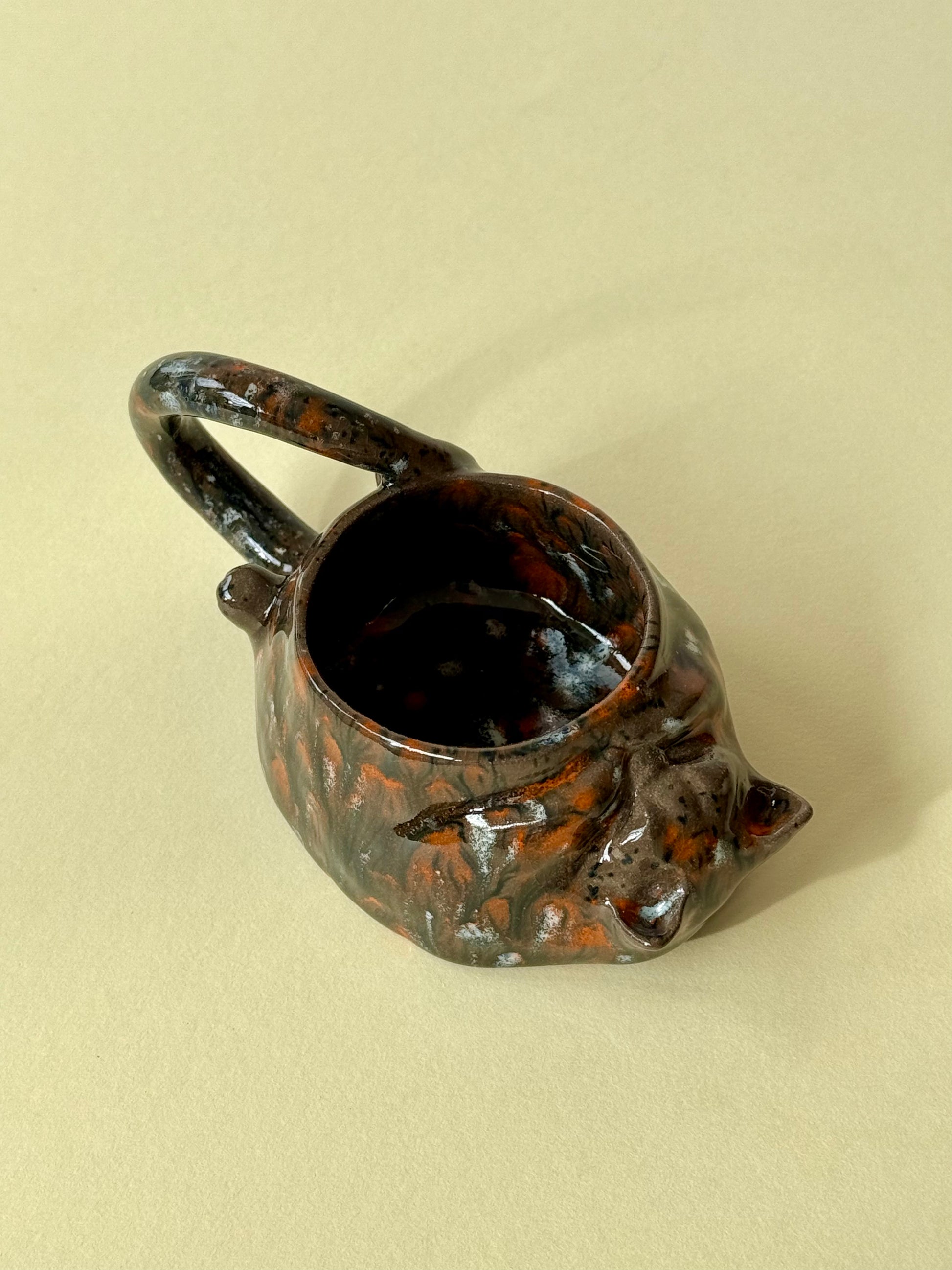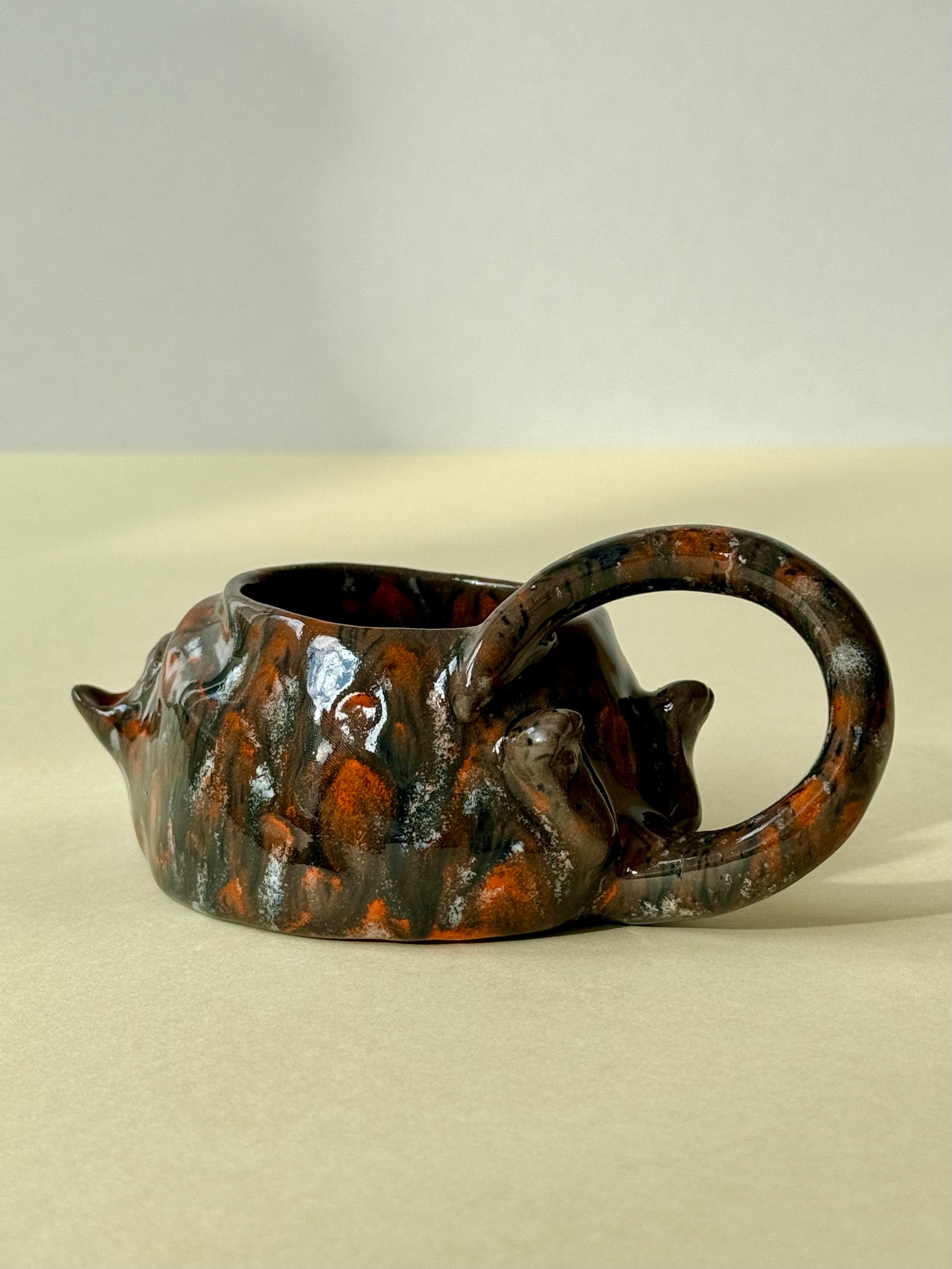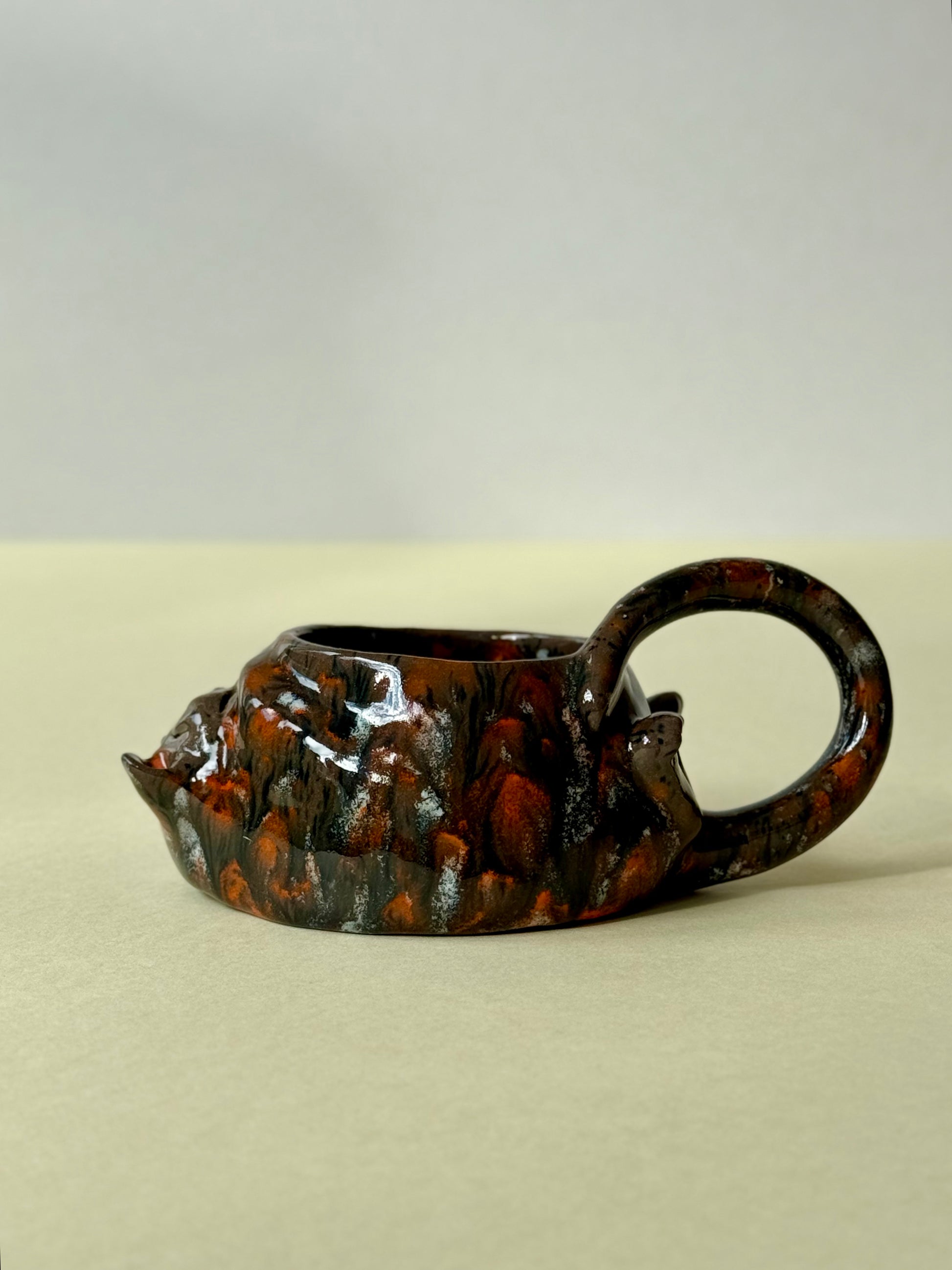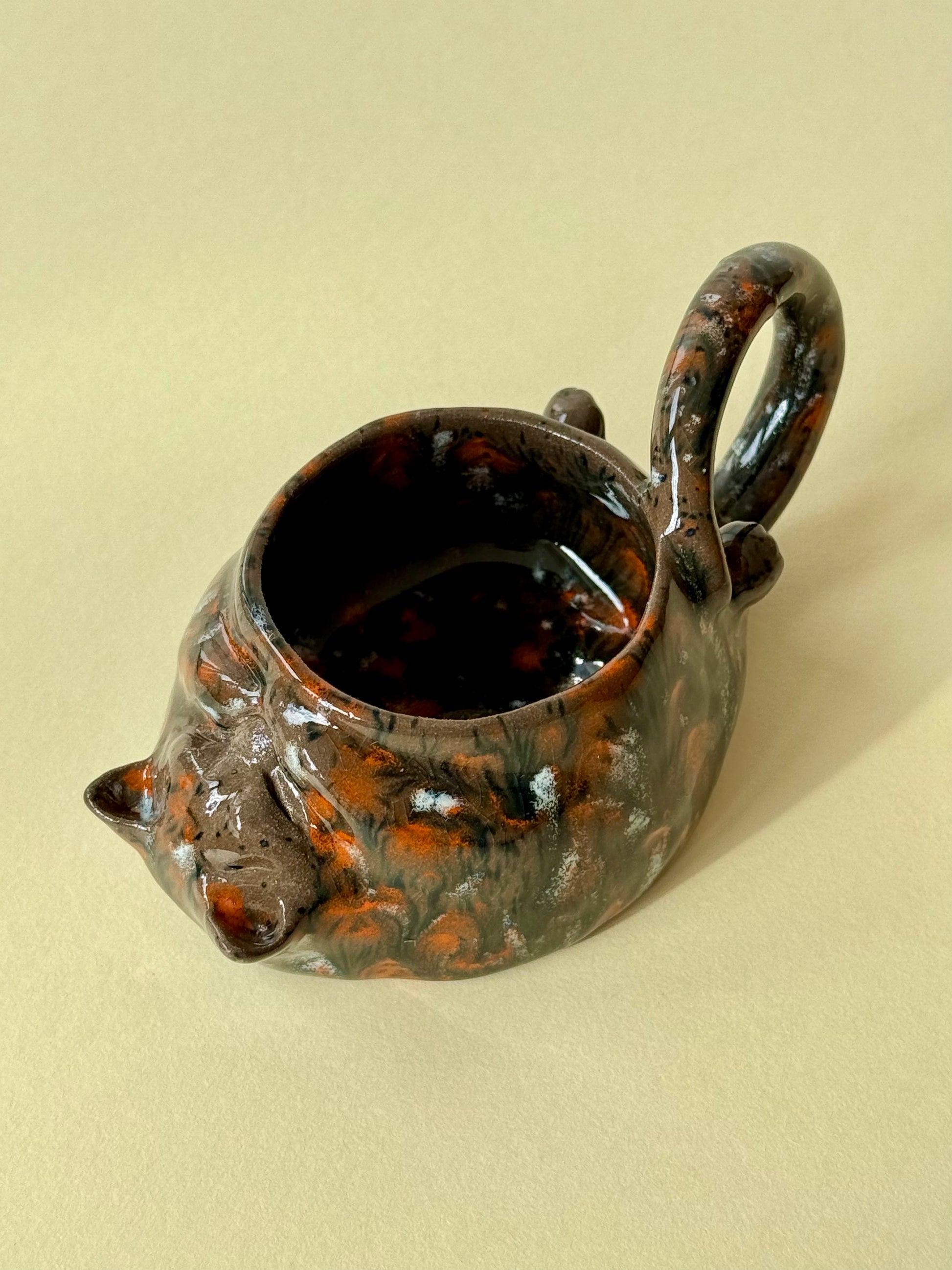 This piece is from a small series called "The Cat's Cycle." The series includes three mugs: "Tired Cat," "Sleeping Cat," and "Woke Up Cat." It's an observational sketch about my cat's life. The cat is sleeping, relaxed, and content. And if you look closely, you can see how he covers his smile with his paw...