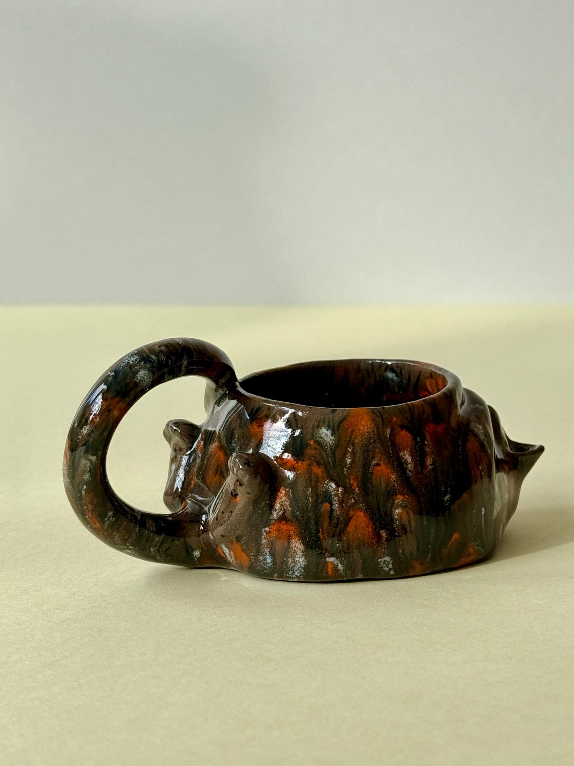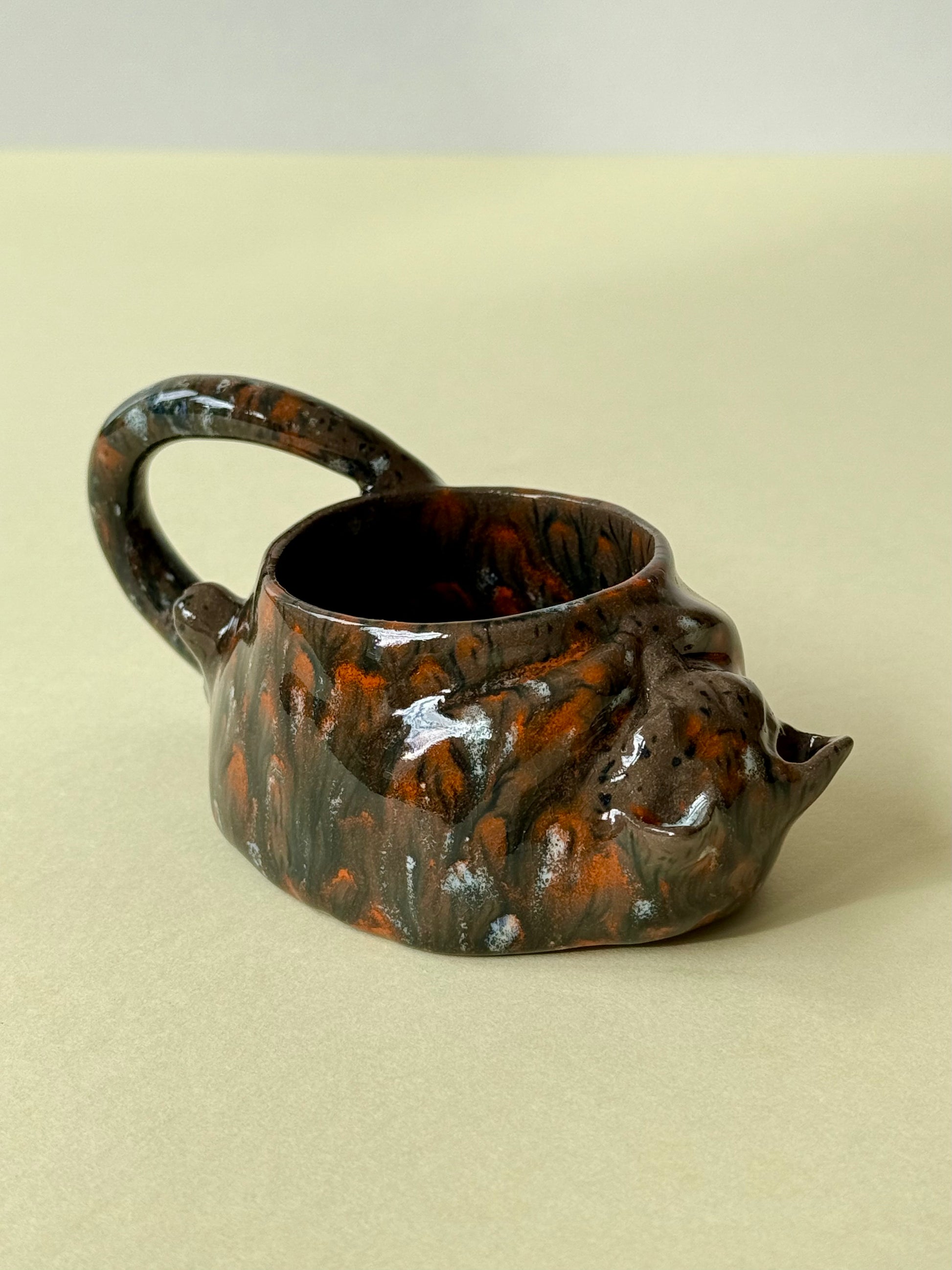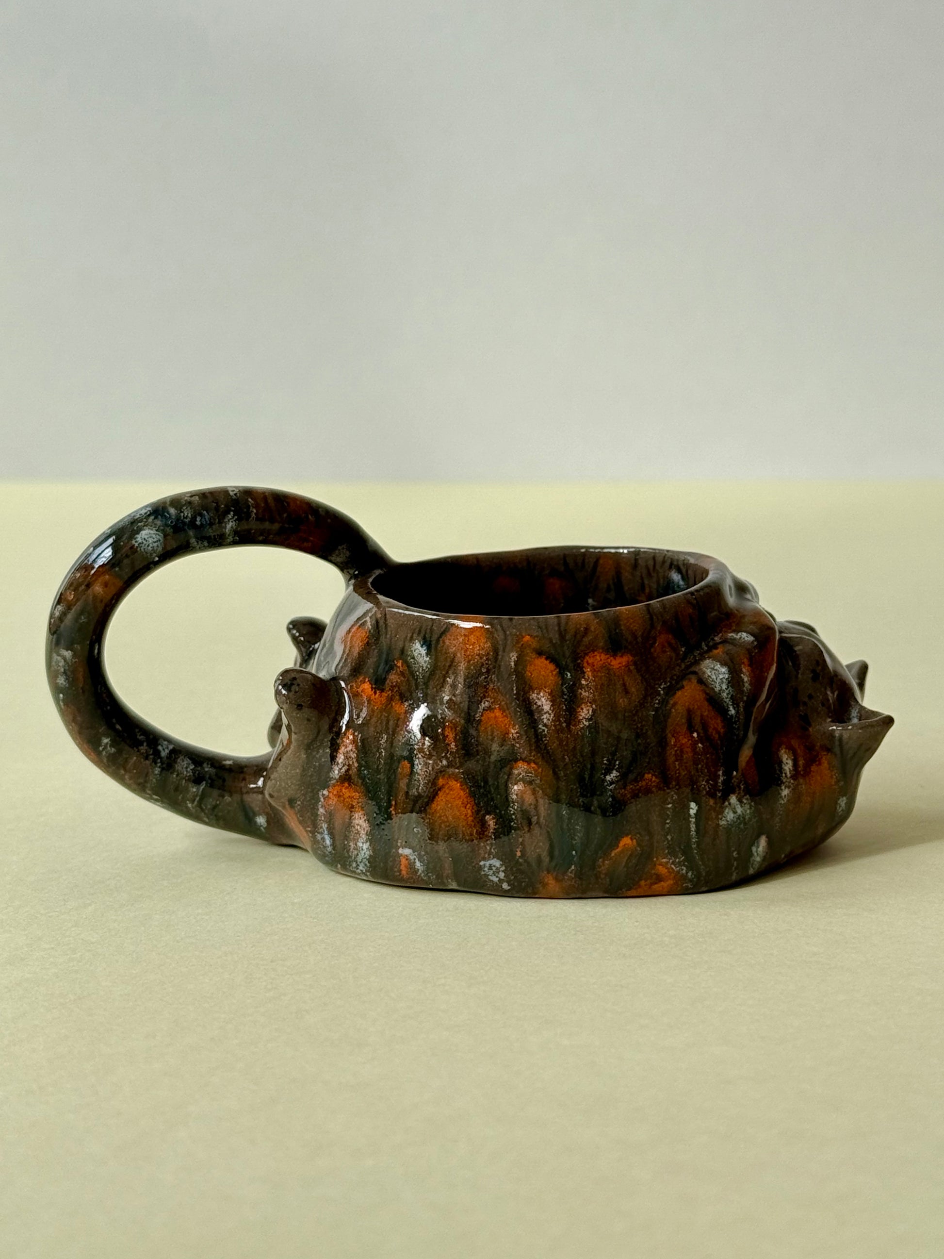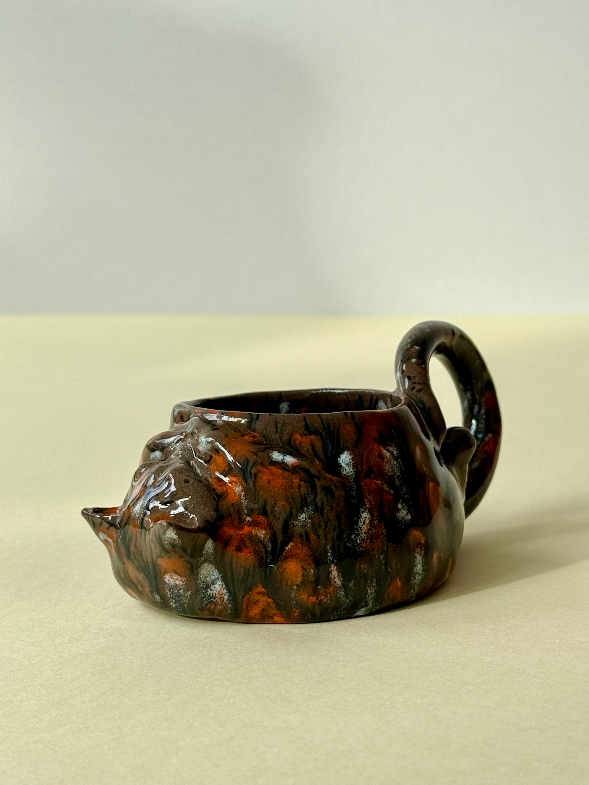 This piece is from a small series called "The Cat's Cycle." The series includes three mugs: "Tired Cat," "Sleeping Cat," and "Woke Up Cat." It's an observational sketch about my cat's life. The cat is sleeping, relaxed, and content. And if you look closely, you can see how he covers his smile with his paw...