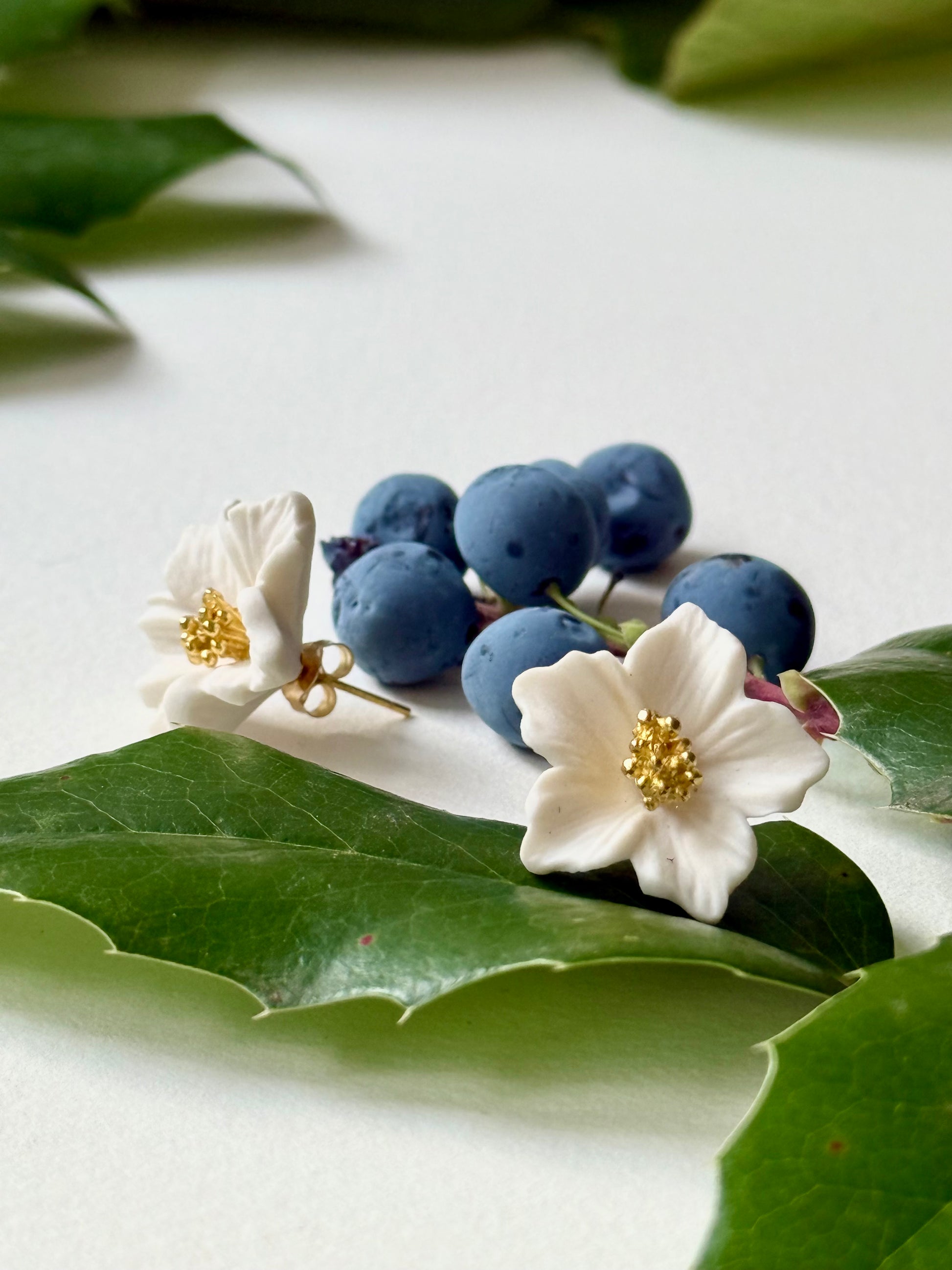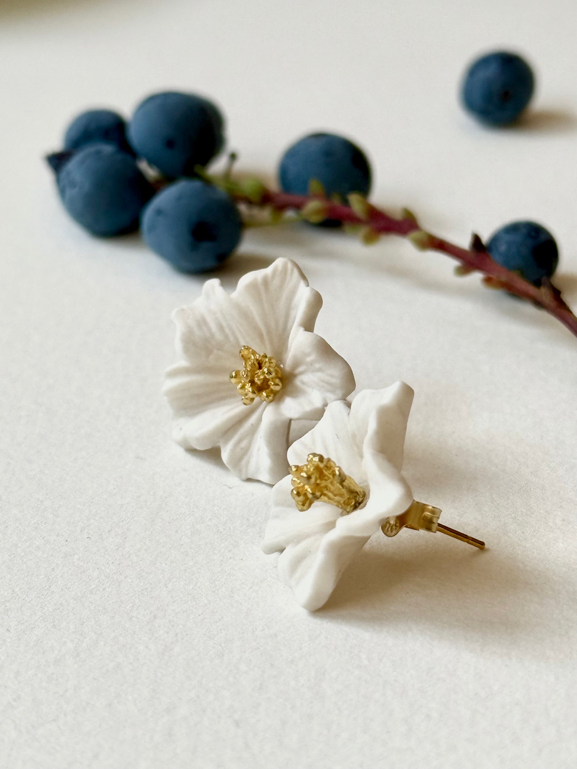 Stud earrings Goldy Bells. The flower is made of porcelain, the fittings are 925 silver with gold plating. The central part of the flower is brass. The weight of each earring is 2,7 g, the size is 23x23 mm.