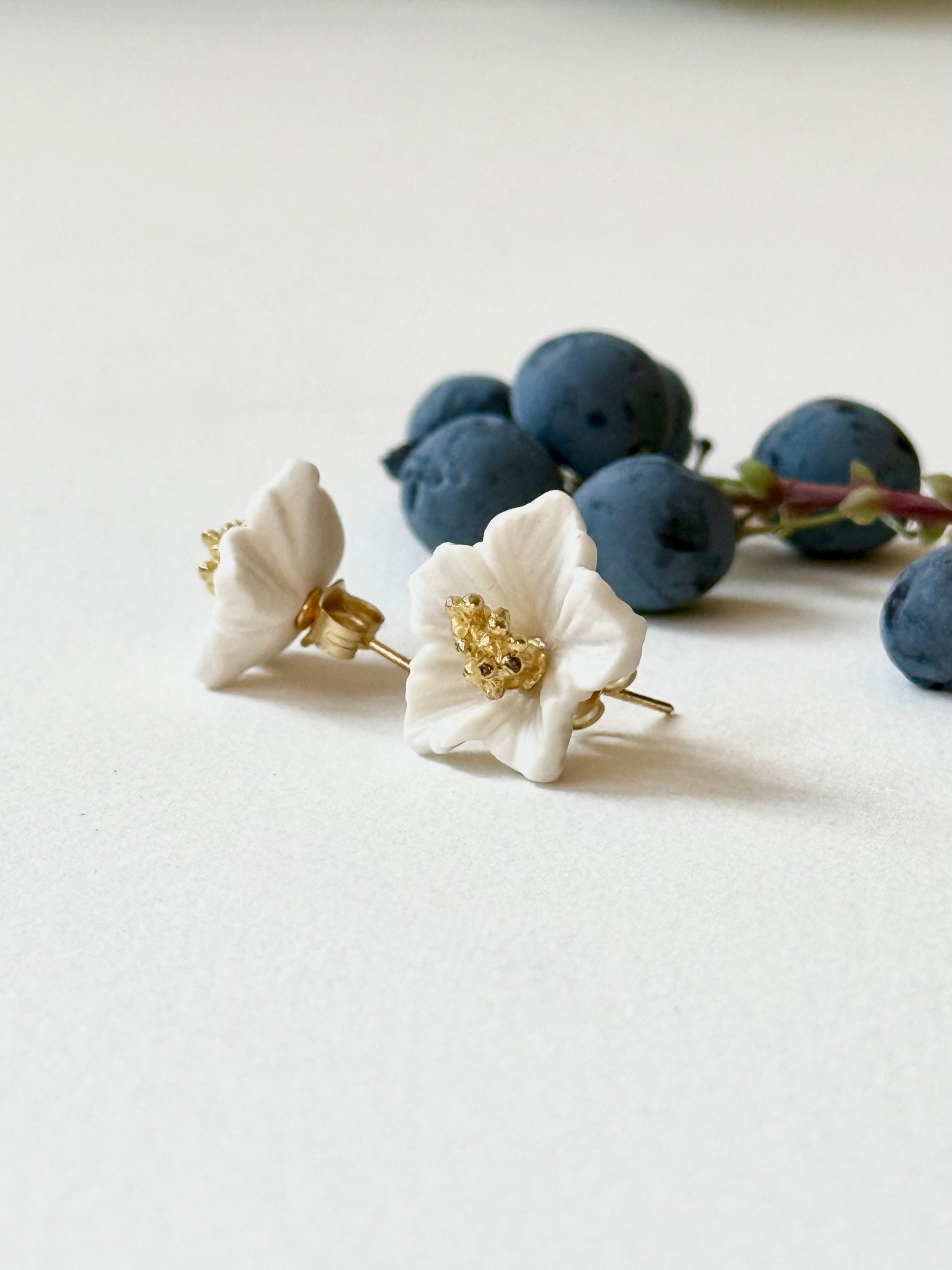 Stud earrings Bells. The flower is made of porcelain, the fittings are 925 silver with gold plating. The central part of the flower is brass. The weight of each earring is 1,9 g, the size is 18x18 mm.