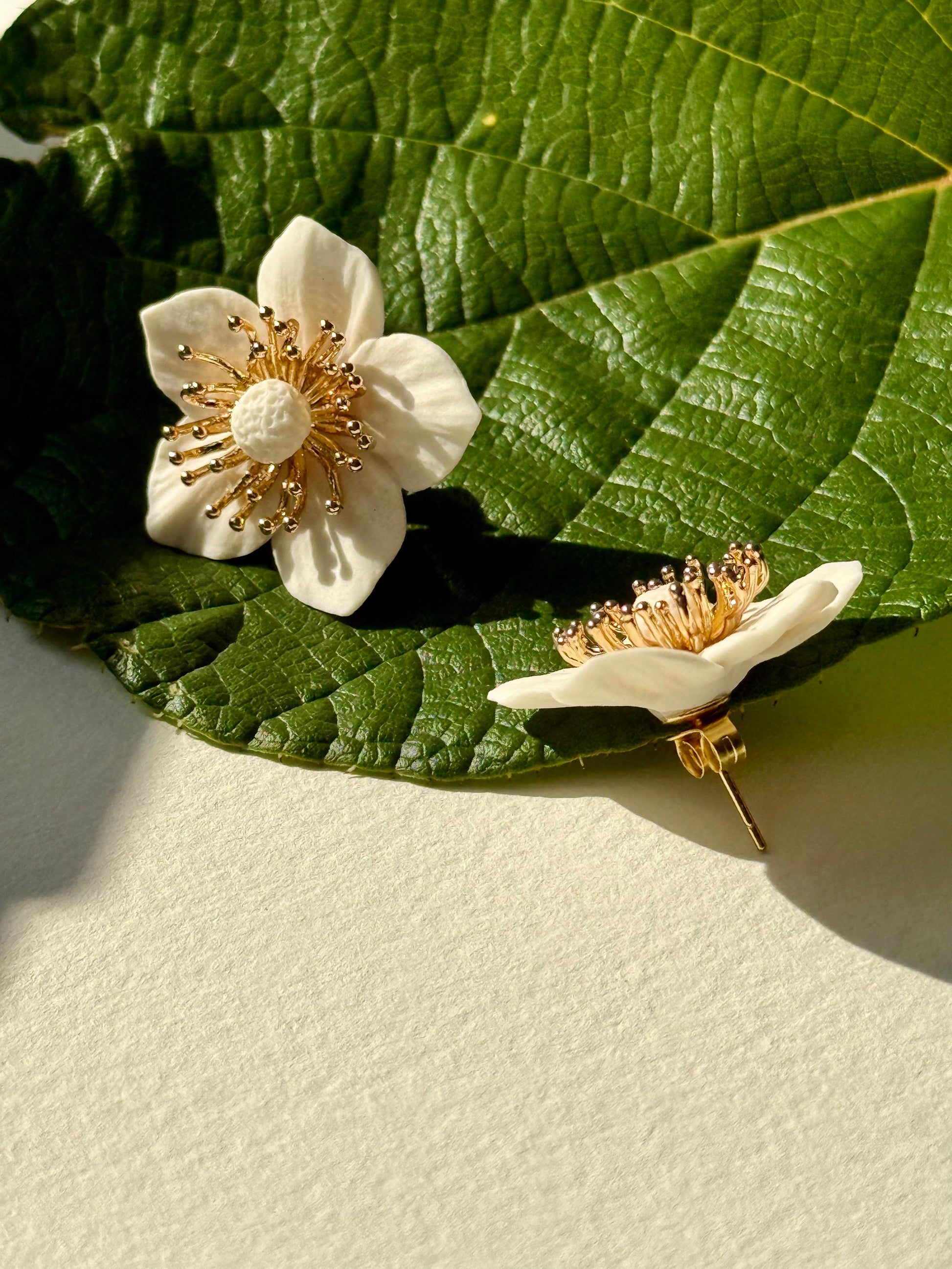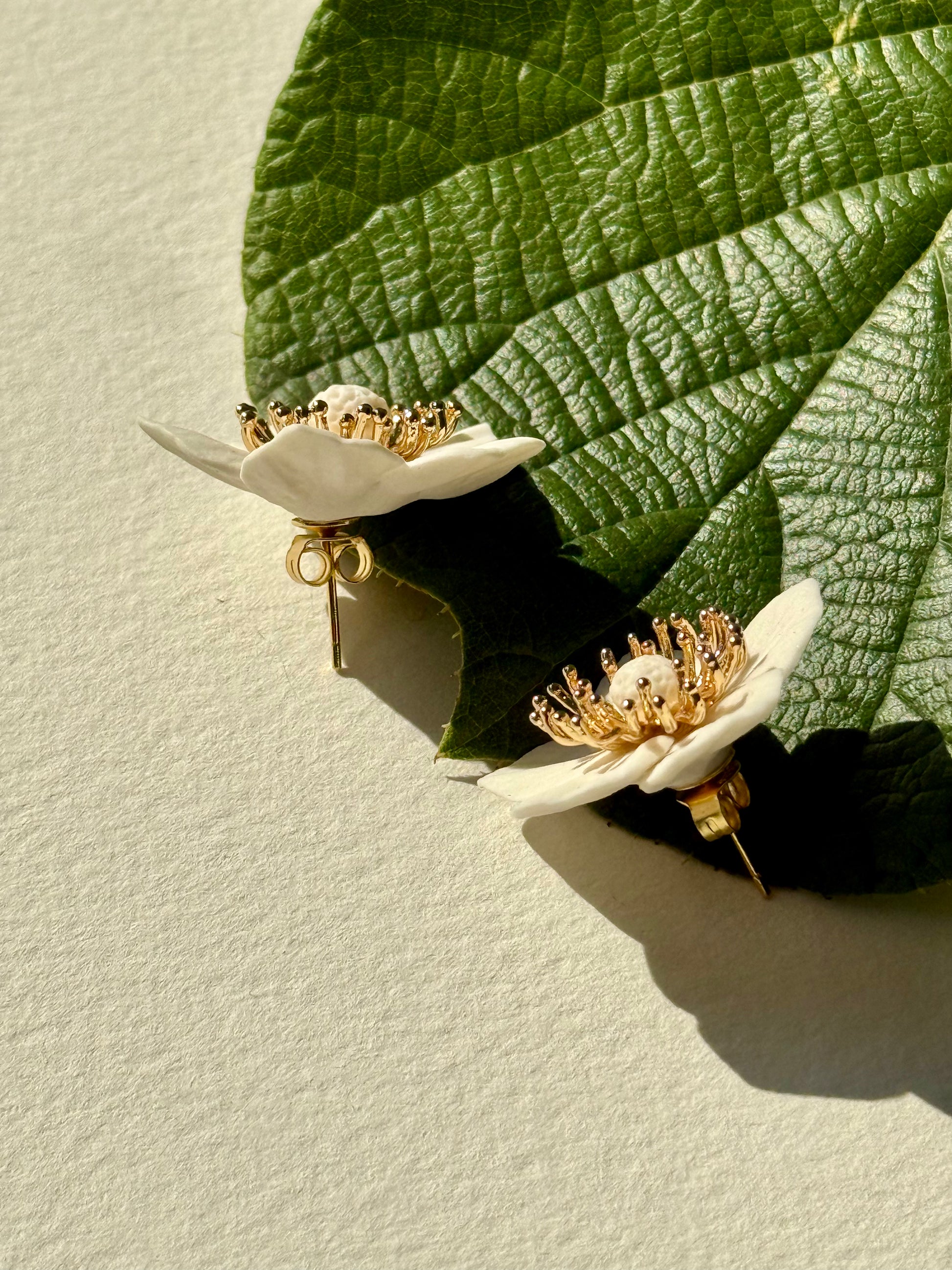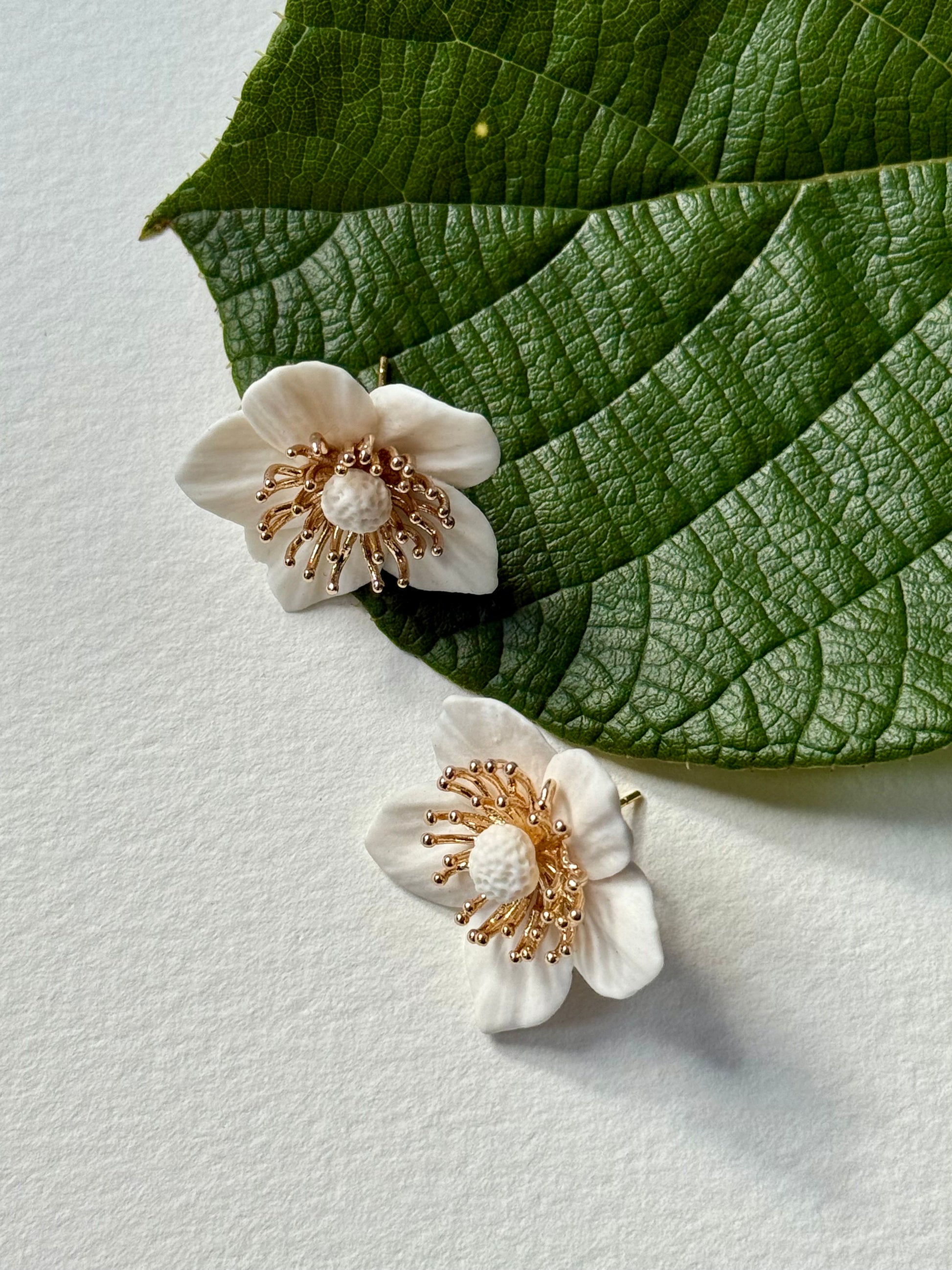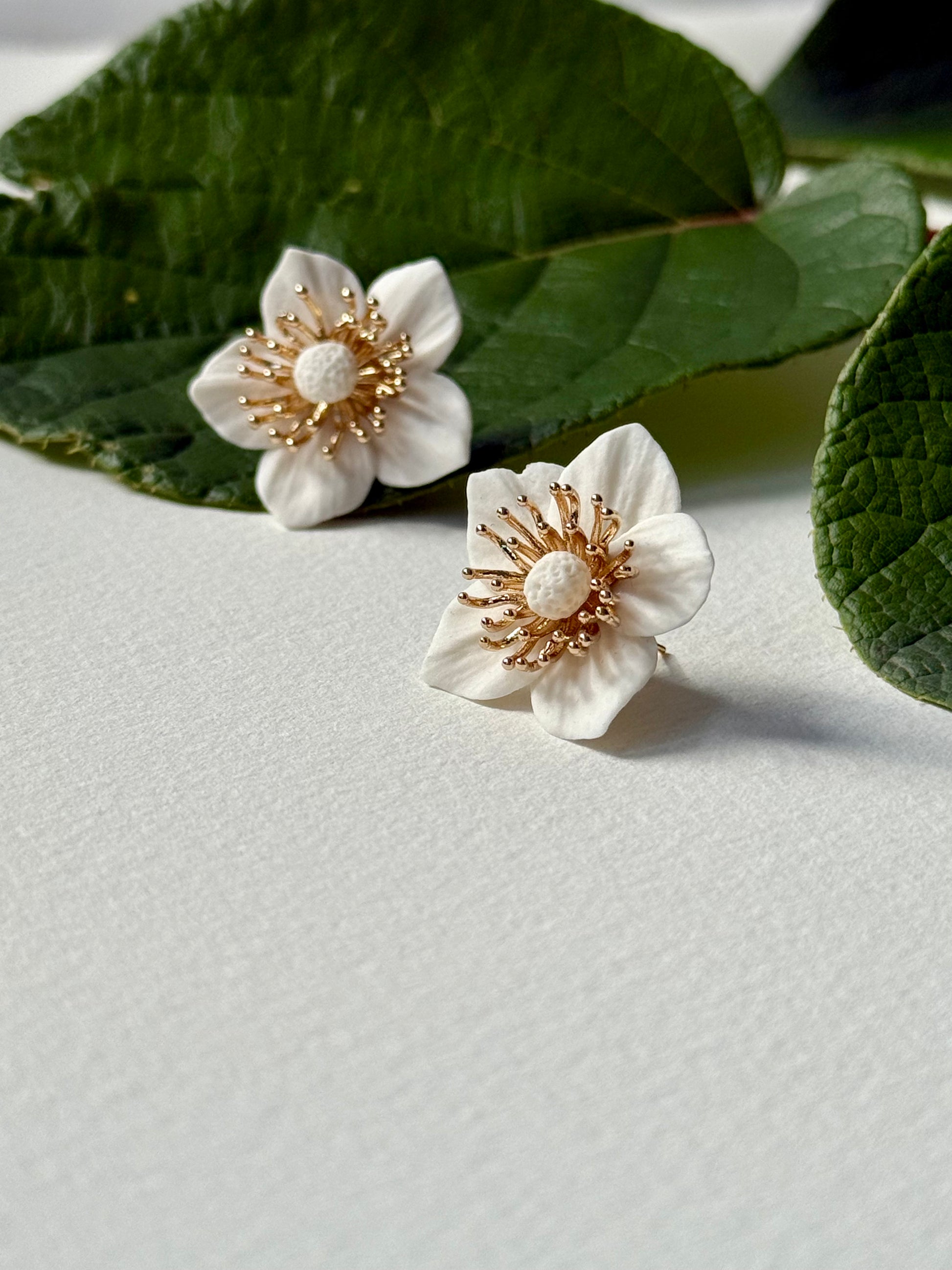 Cherry blossom stud earrings. The flower is made of porcelain, the material of the fittings is 925 sterling silver gold plated. Brass flower center. Each earring weighs 3.6 g, size 30x30 mm.