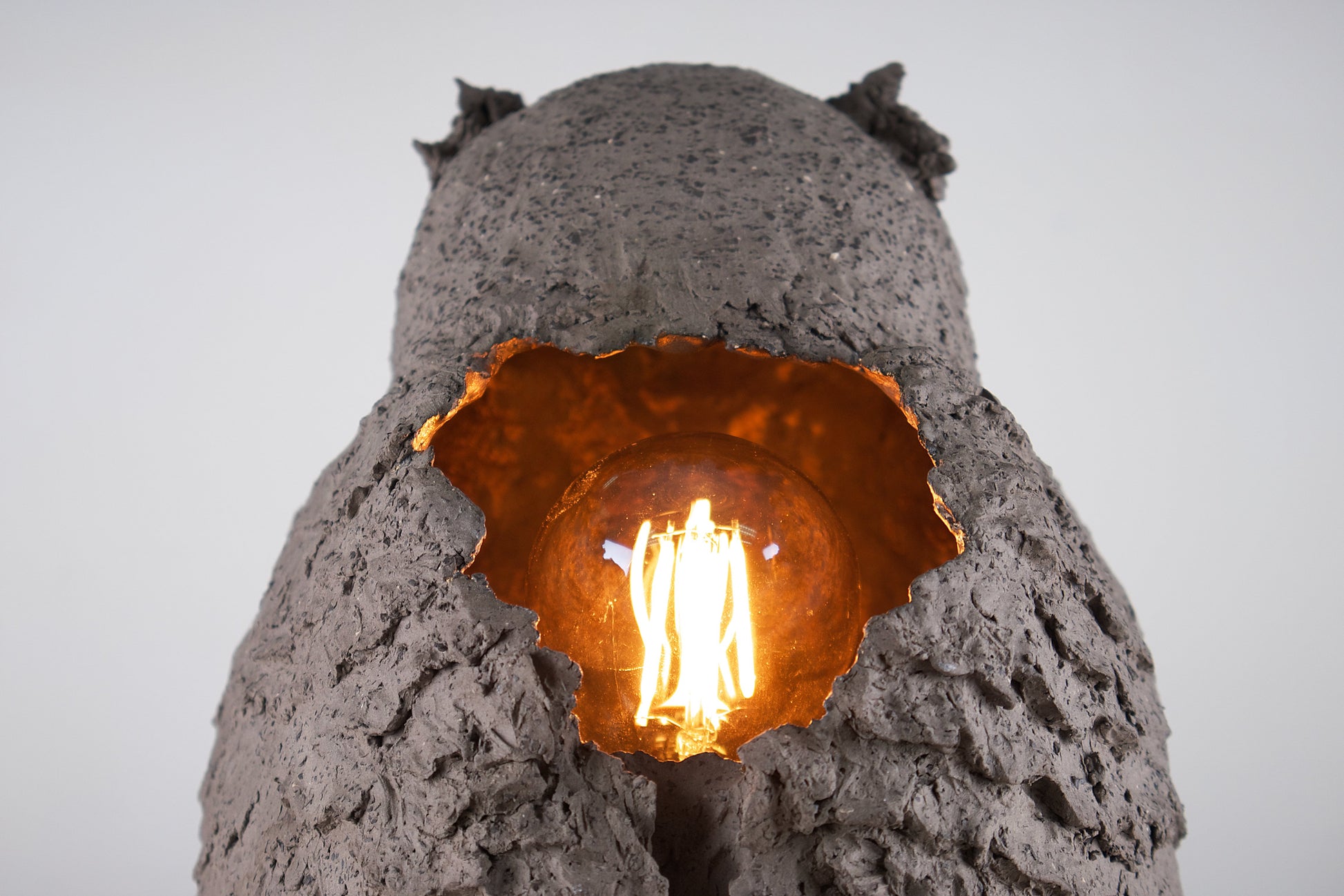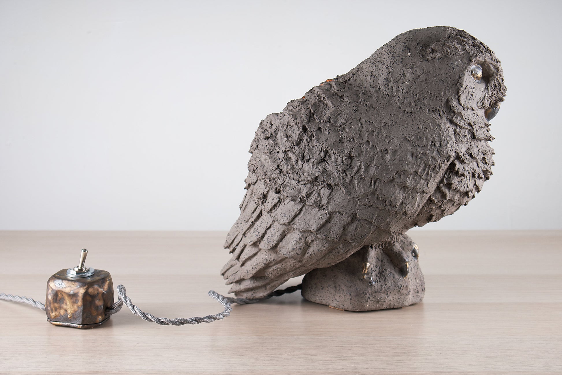 The owl is a sculptured lamp. It is crafted from stone mass with added chamotte and covered with a metallic glaze. The fittings, such as the base for the light bulb and the switch, are also handcrafted specifically for this composition. The owl casts a soft light, creating a cozy atmosphere.