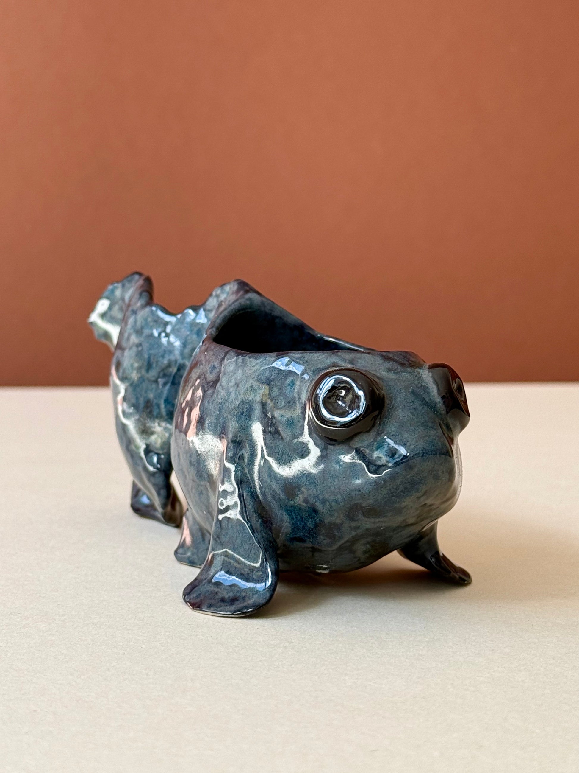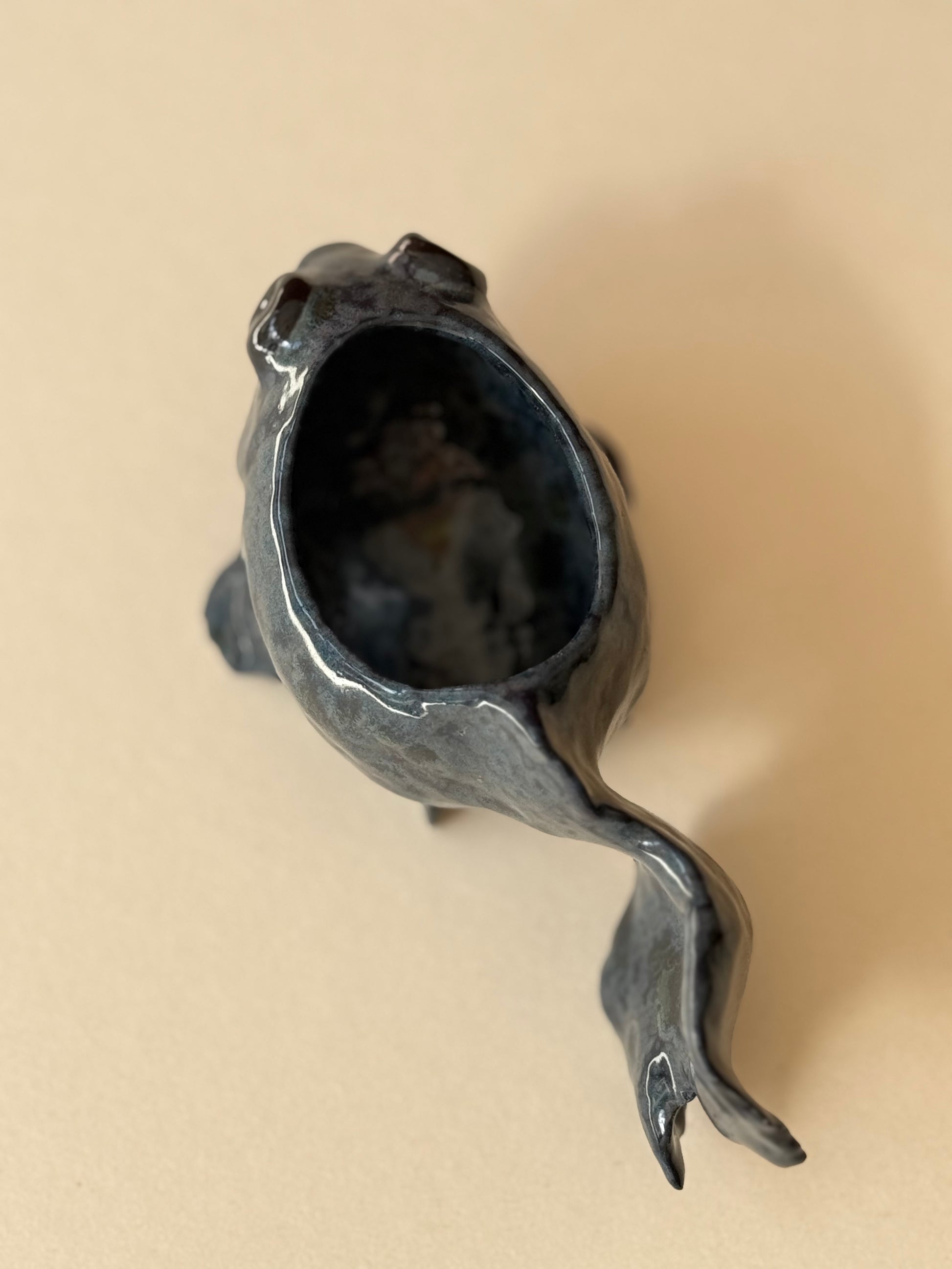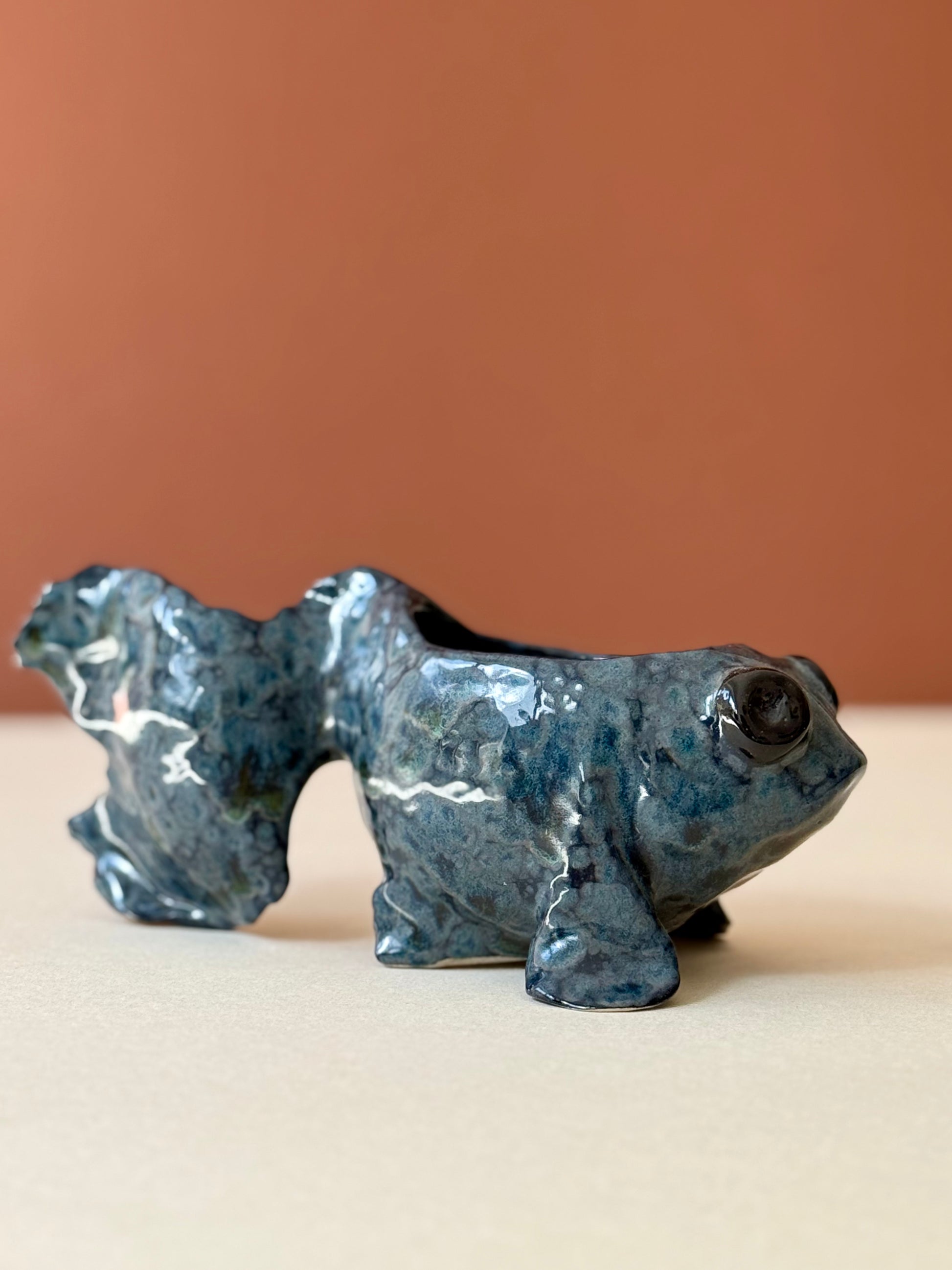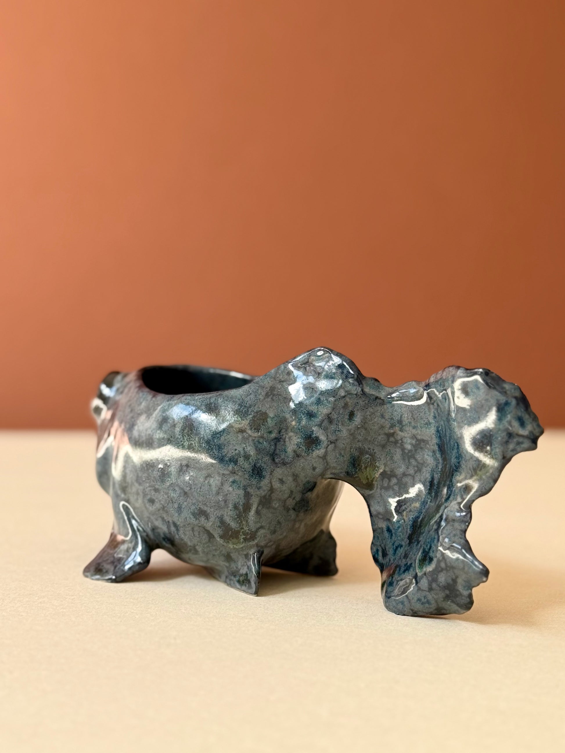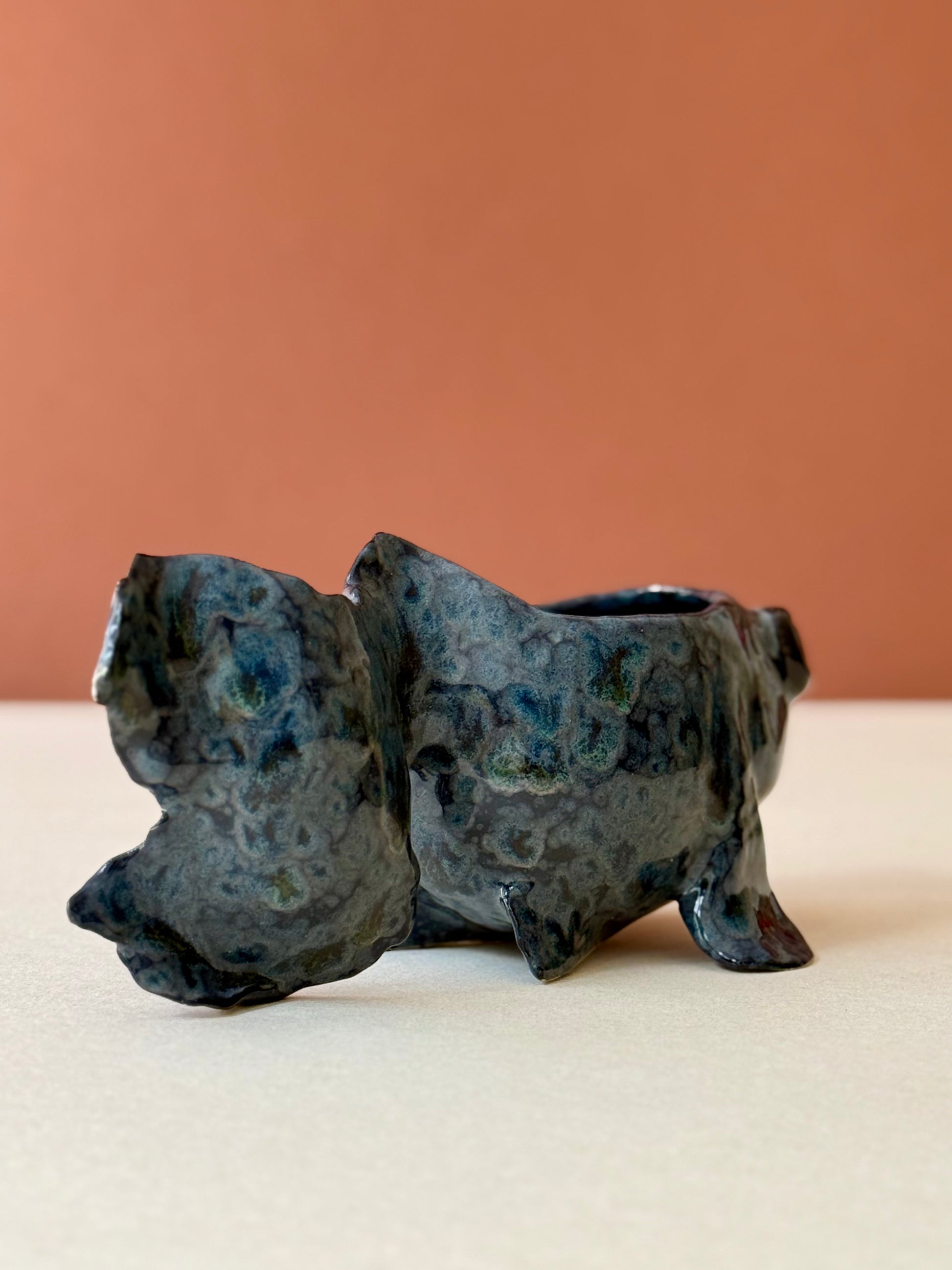 Sculpted from stone mass and covered with a crystalline glaze.