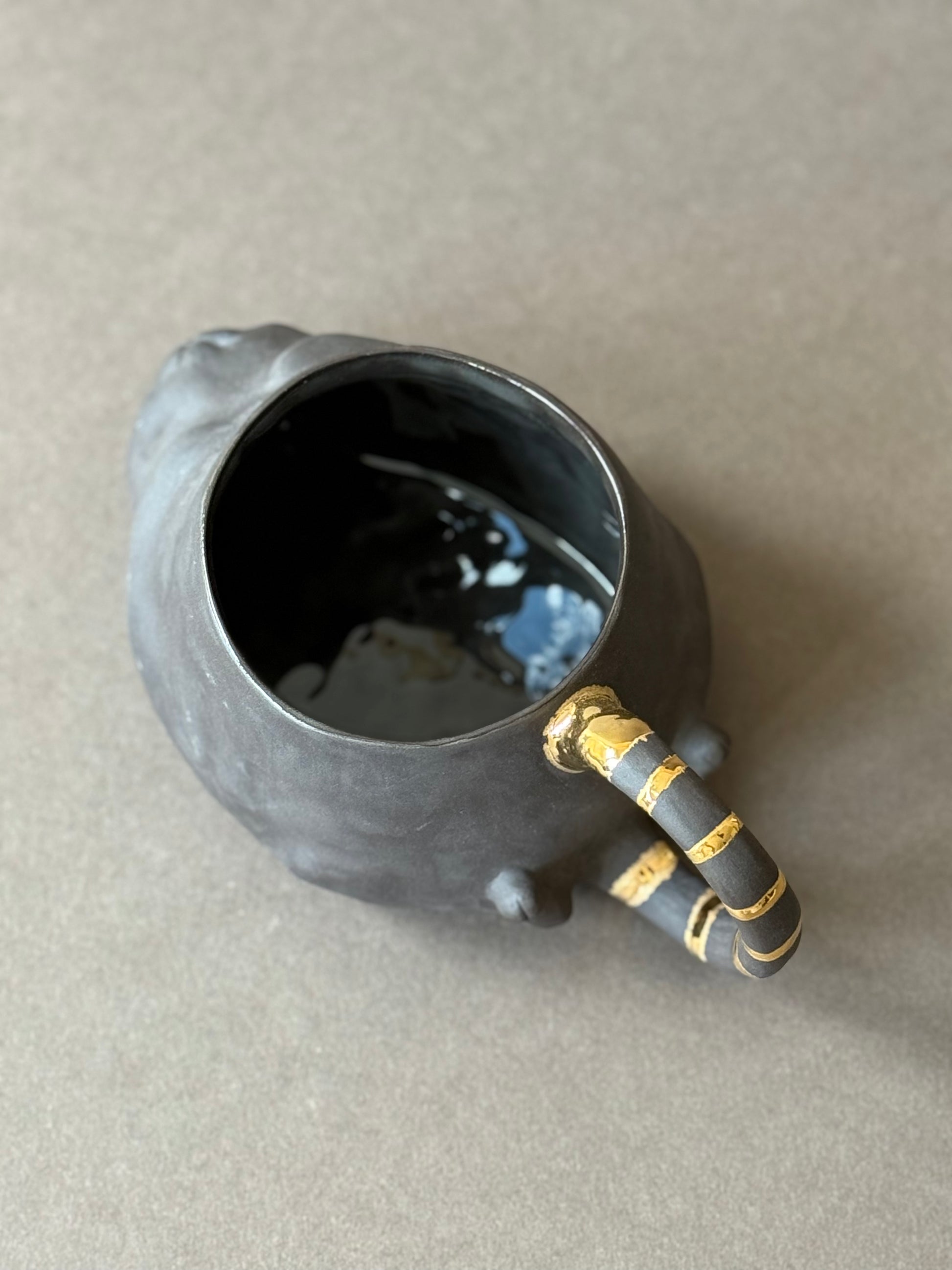 The interior is covered with a clear glaze, and the striped tail is made of 12% gold.