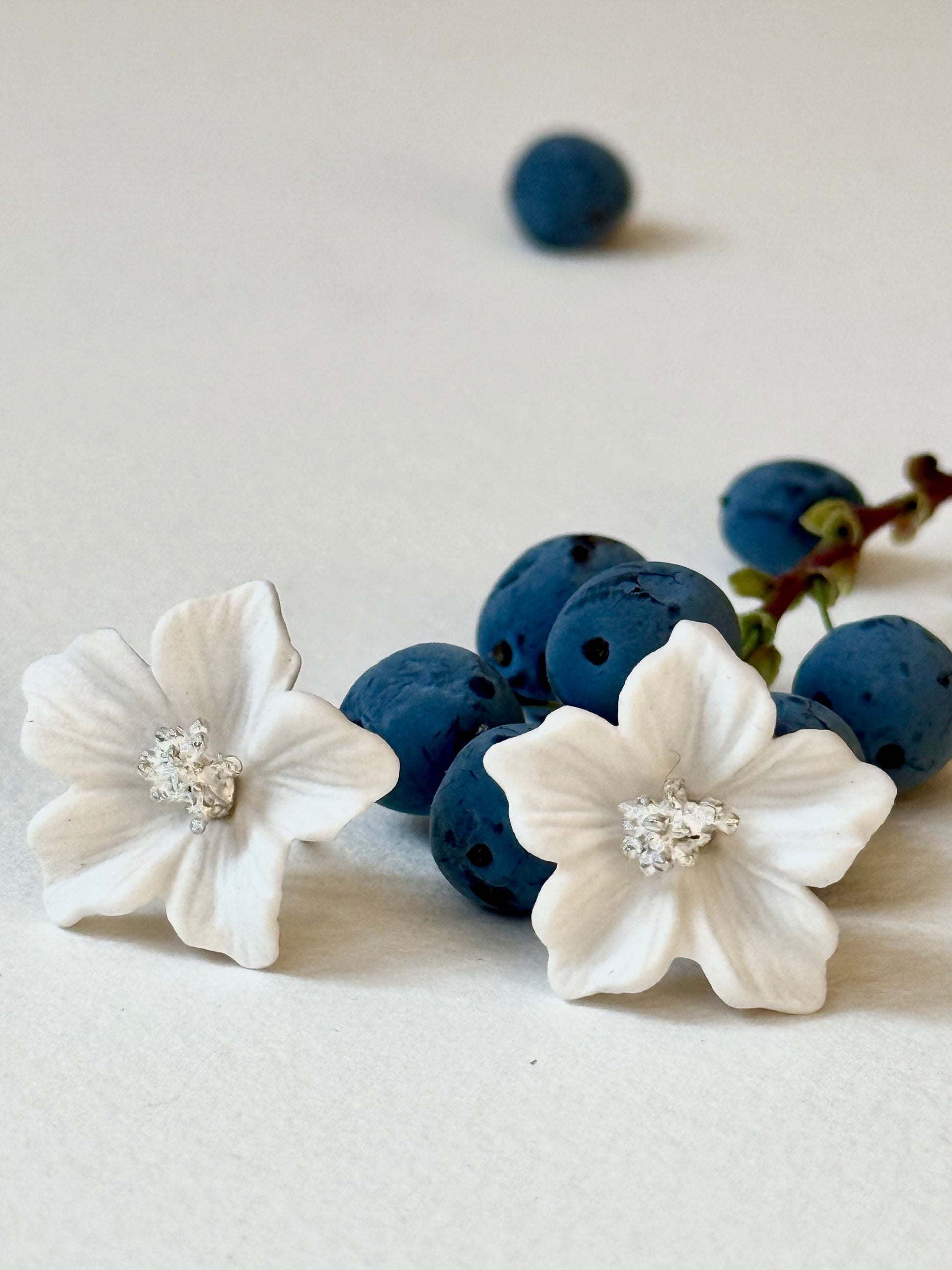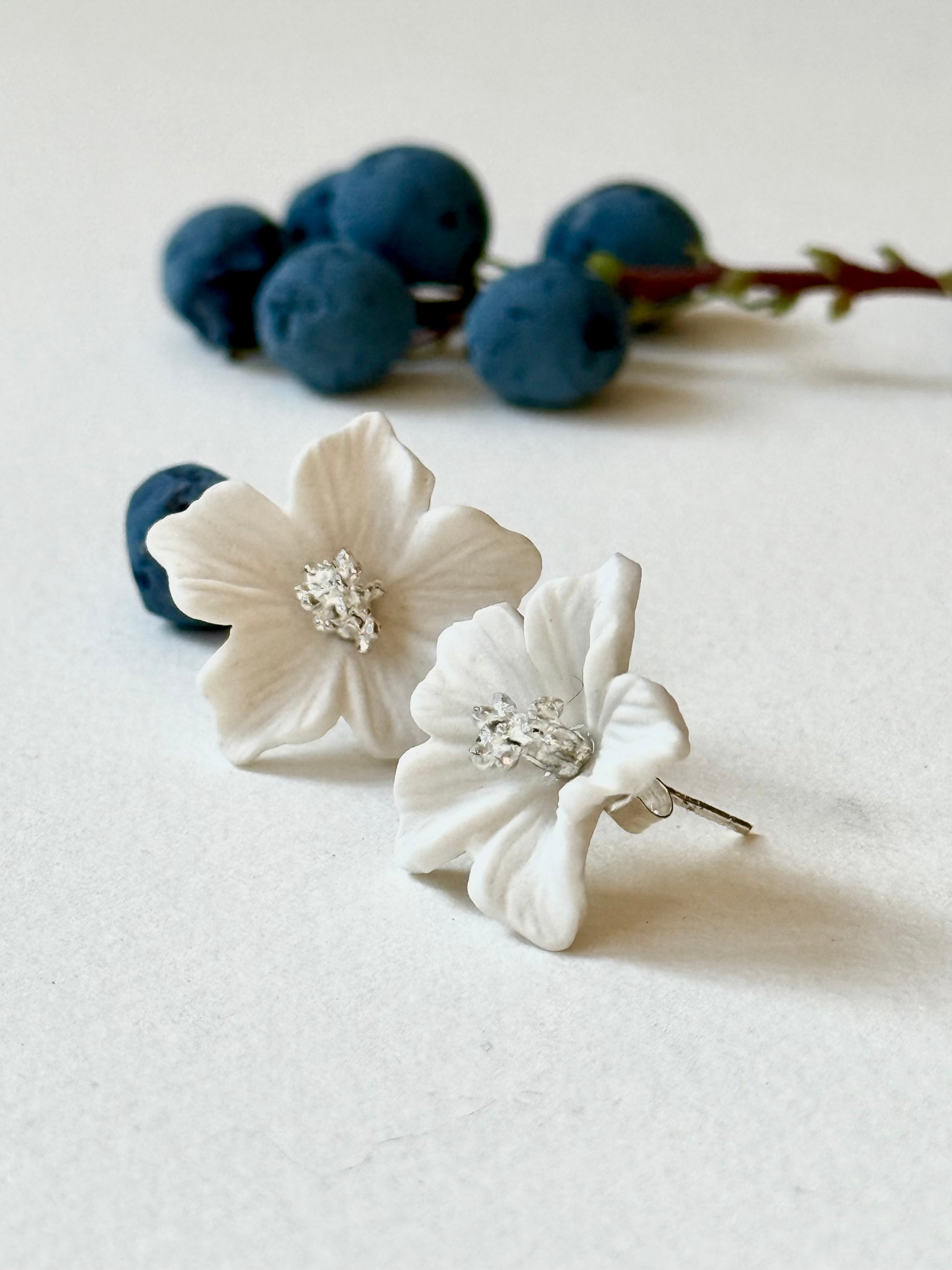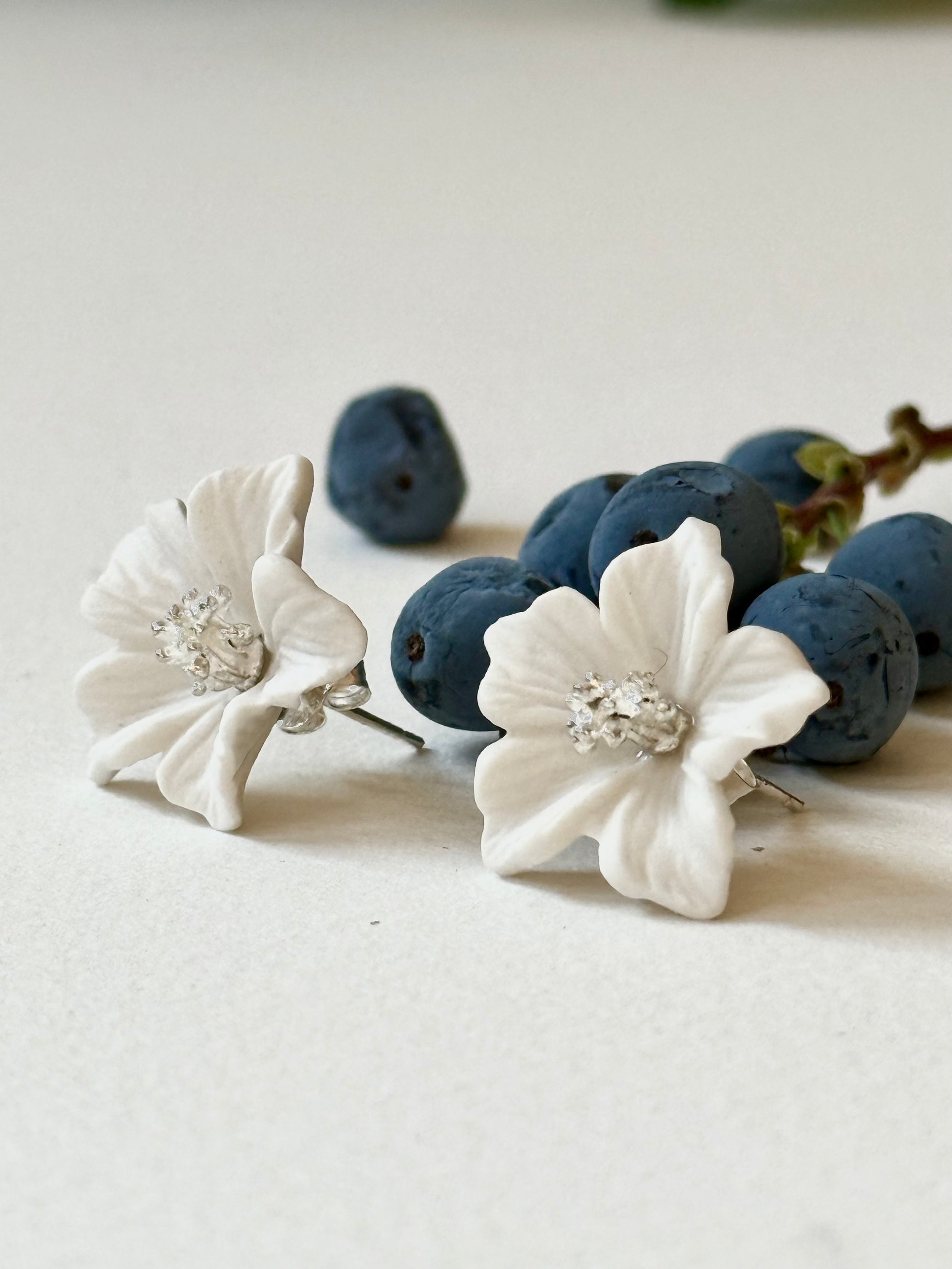 Earrings-studs Bells. The flower is made of porcelain, fittings - 925 silver. The central part of the flower is brass. The weight of each earring is 2,7 g, size 24x24 mm.