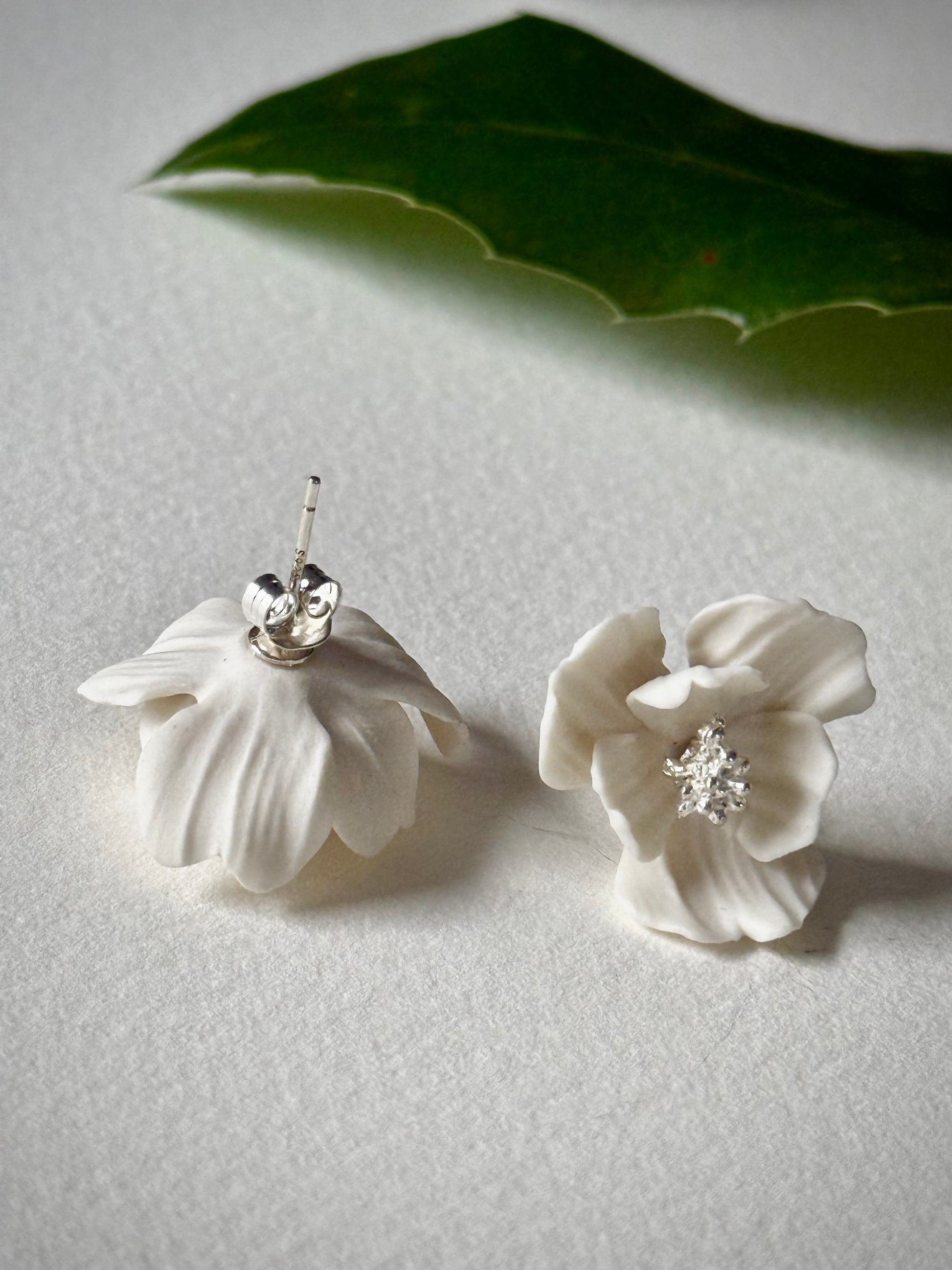 Stud earrings Wavy Petals. The flower is made of porcelain, the fittings are 925 silver. The central part of the flower is brass. The weight of each earring is 2,7 g, the size is 26x26 mm.