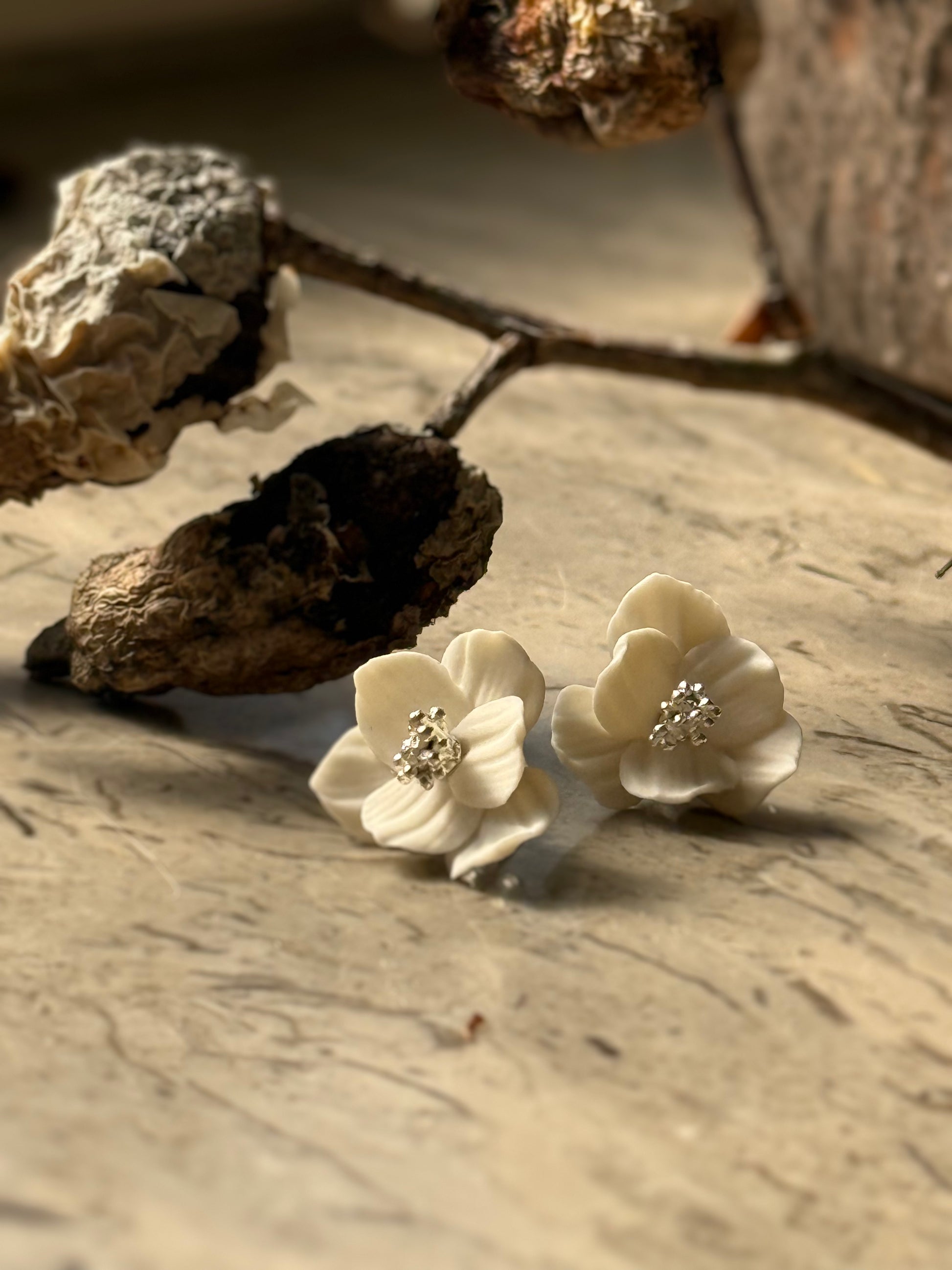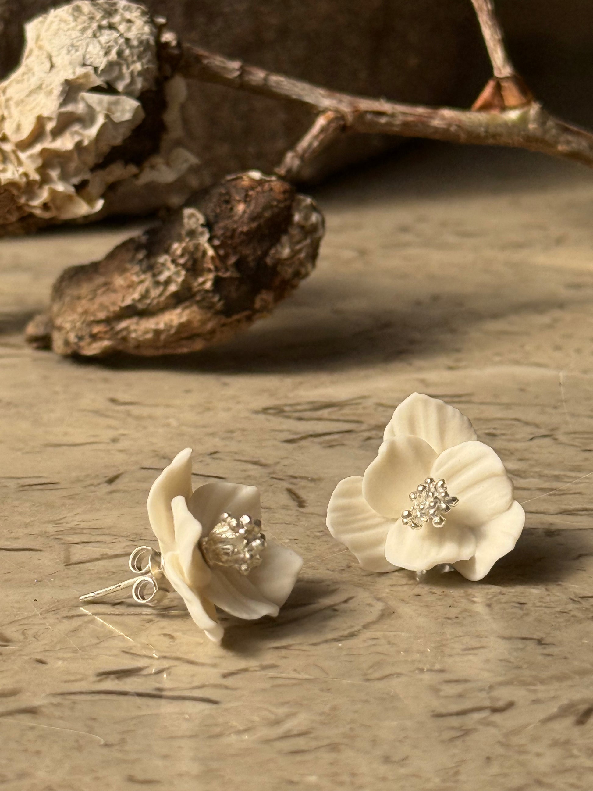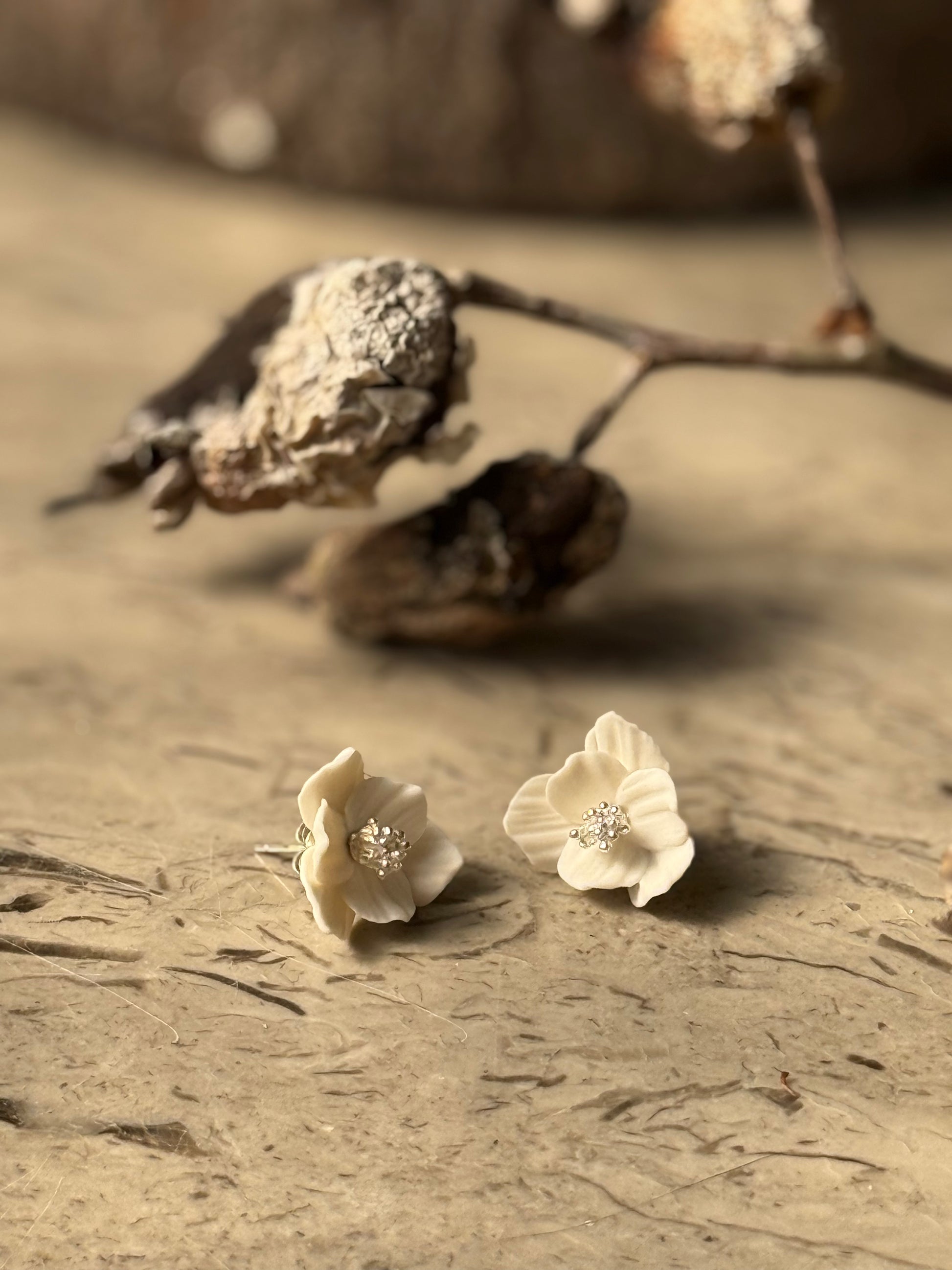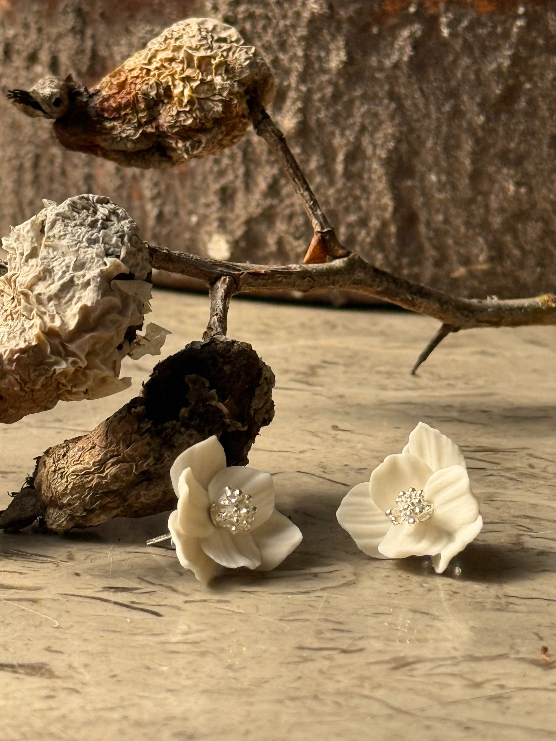 Stud earrings Tiny Snowdrops. The flower is made of porcelain, the fittings are 925 silver. The central part of the flower is brass. The weight of each earring is 2,2 g, the size is 20x20 mm.