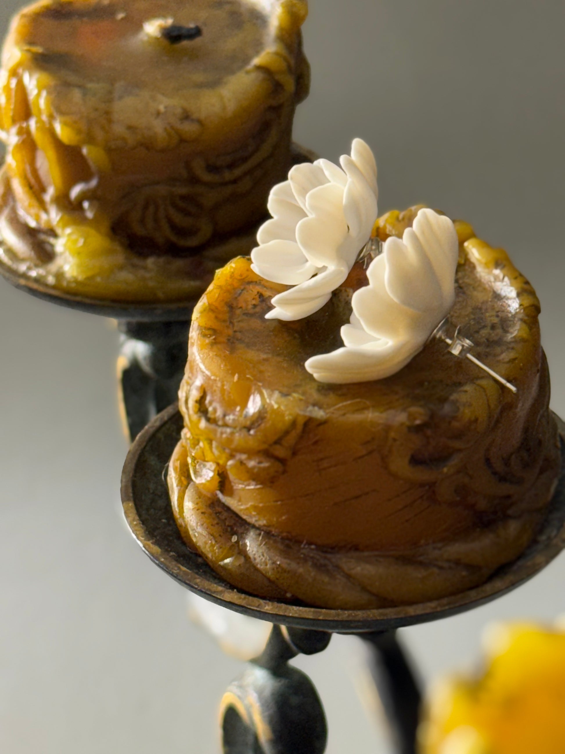 Earrings with wavy petals made of porcelain. The flower core is plated with platinum. A pendant is included to complete the set.